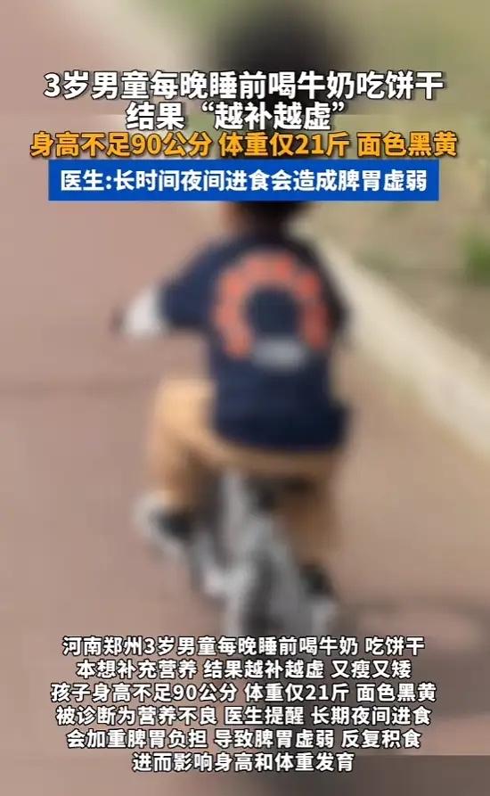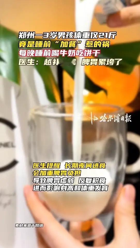 “万万没想到!”河南郑州,一男孩为了补充营养,每晚睡前都要喝牛奶吃饼干,不料男孩越补越虚,3岁的他身高不足90公分,体重只有21斤,去医院一看,才知道男孩长期夜间进食,给脾胃“累垮了”,最终确诊为营养不良!网友:还是要科学育儿!