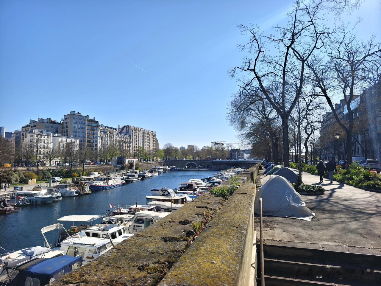 一个地方是在巴士底狱广场的圣马丁运河边,数十顶帐篷沿着岸边安营扎寨。