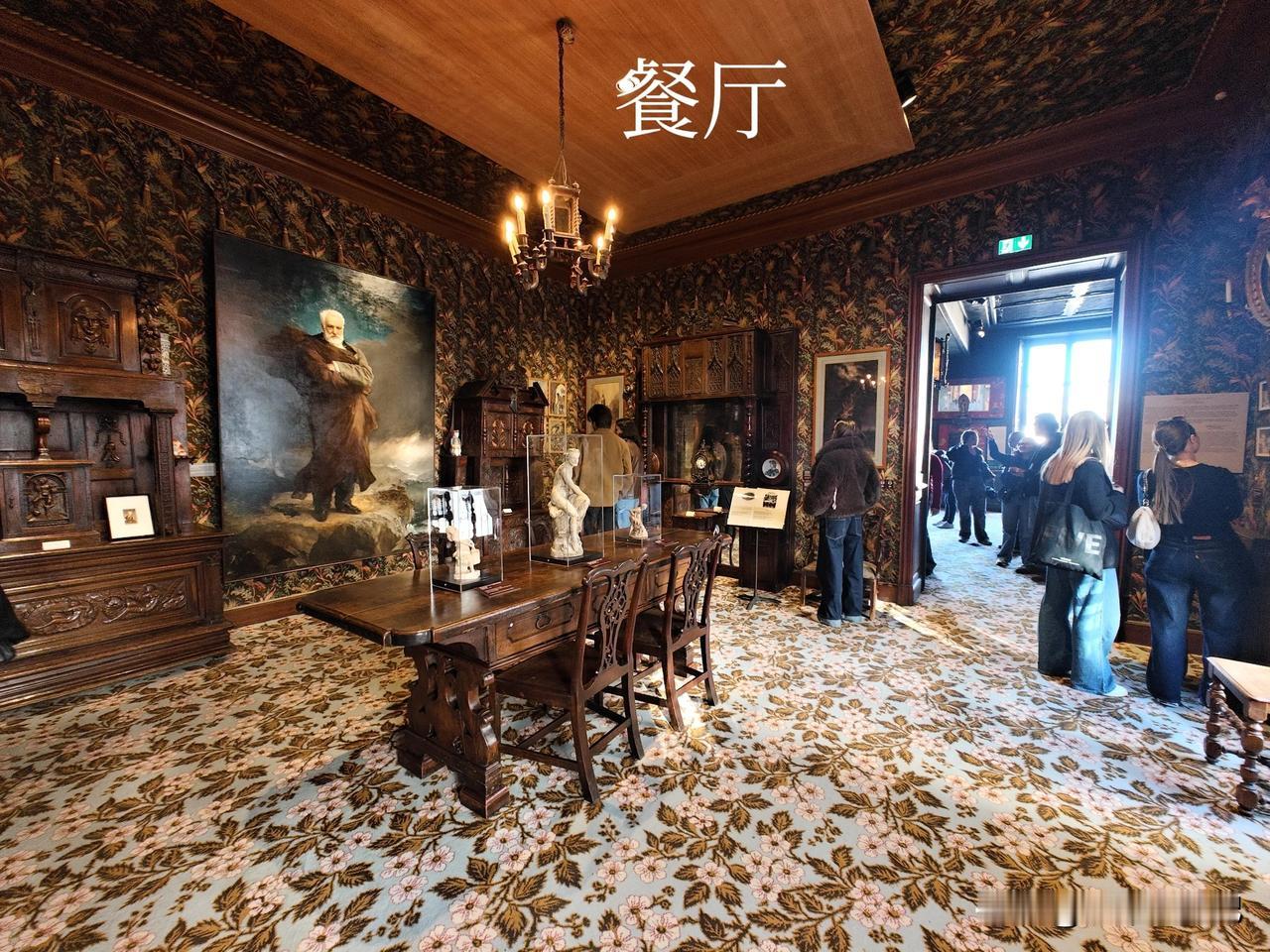 餐厅是中世纪的哥特复兴风格,深色的橡木餐边柜,雕花椅子,贴了瓷砖的壁炉,还有银器、陶瓷、餐具等等。