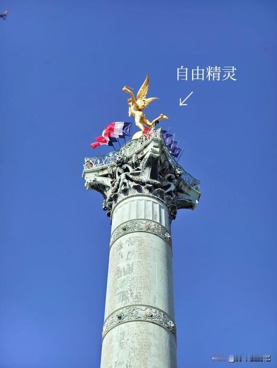 1840年,一根粗大高52米的青铜柱纪念碑落成,以纪念1830年发生的七月革命牺牲者。圆柱顶端有个镀金的自由精灵雕像,他挣断了锁链,象征着人民挣脱了专制统治。纪念柱的基座上刻着革命者名录,地下就是烈士陵墓。