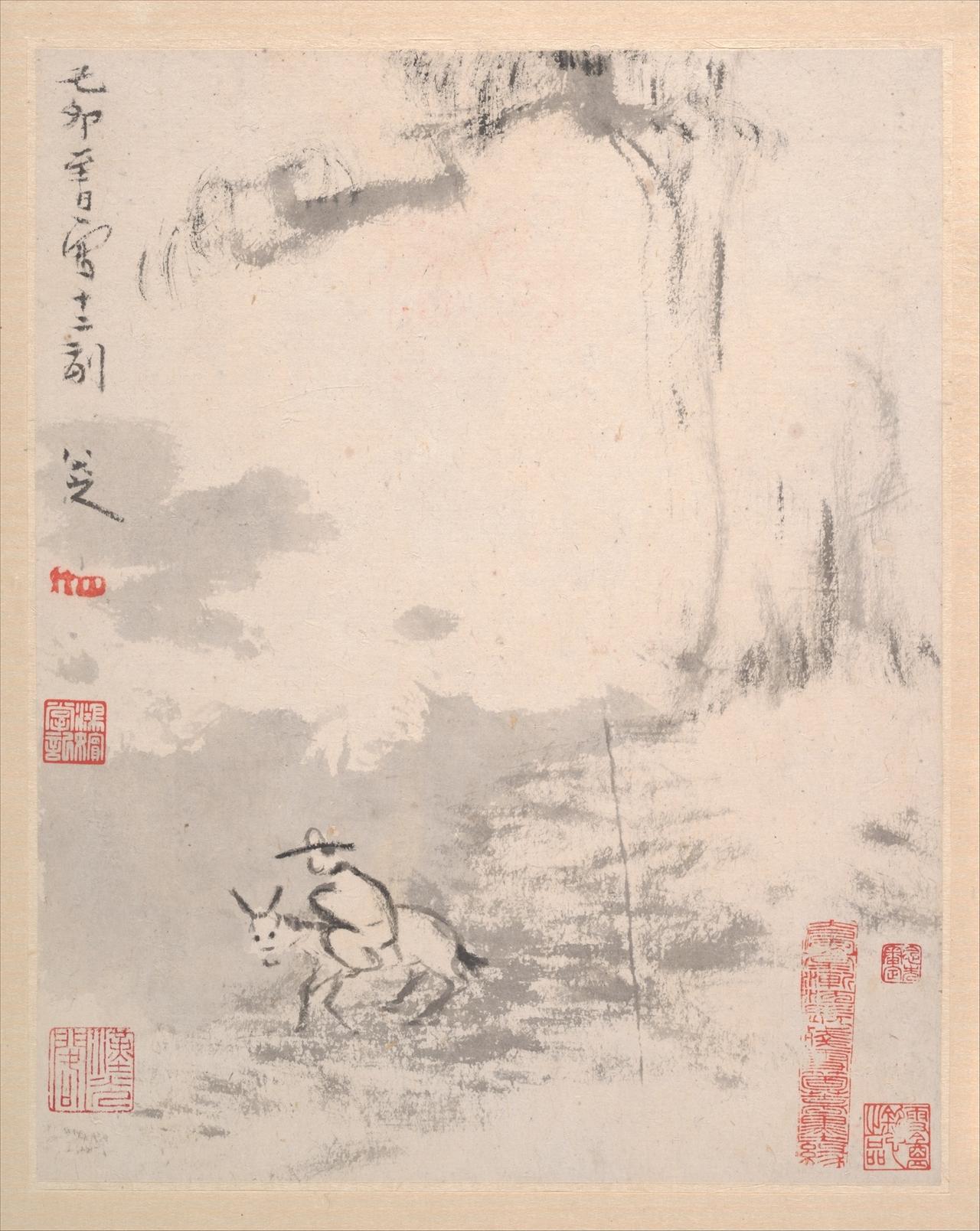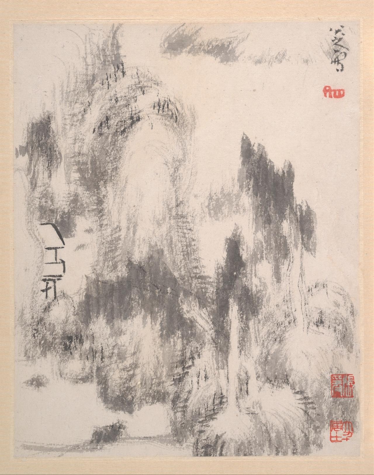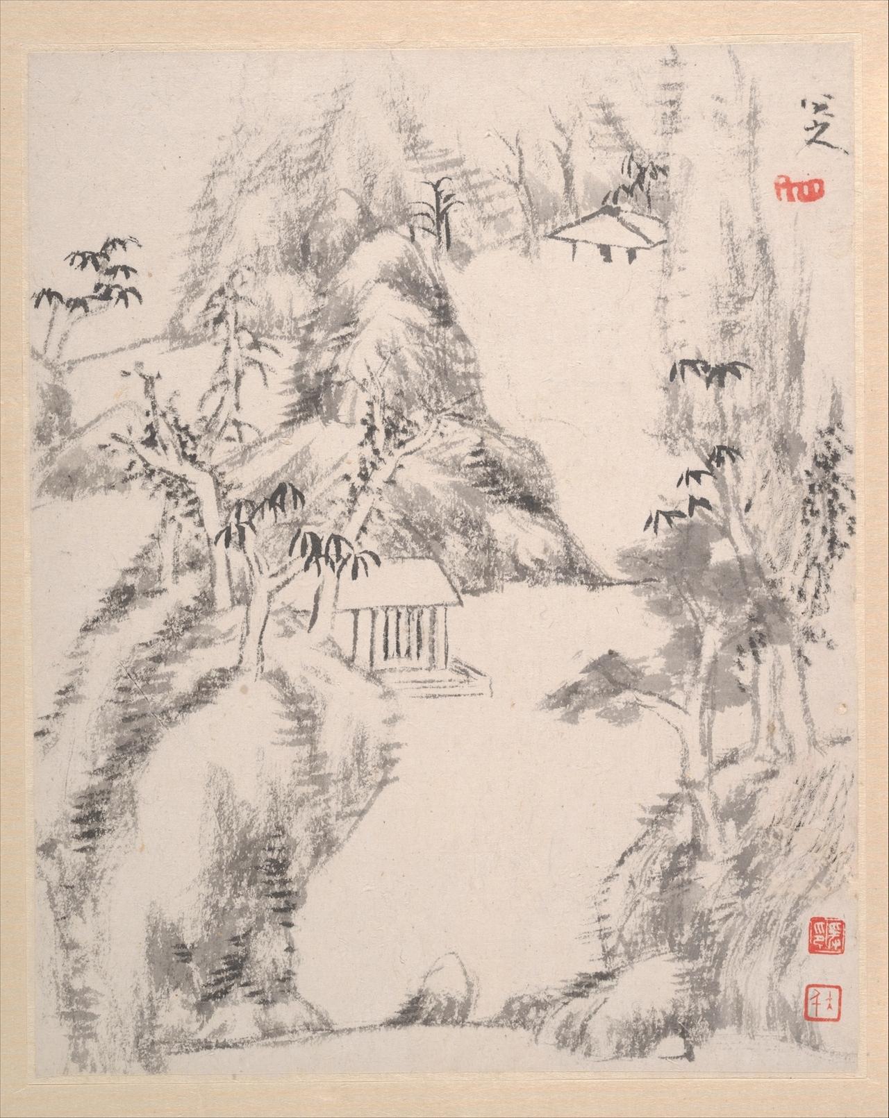 八大山人晚年笔墨,已入化境。作于1699年的这套山水图册,现藏纽约大都会艺术博物馆,是他74岁心境与技艺的极致呈现。不尚繁景,不施重彩,只以寥寥渴笔、大片留白,便构出一片冷逸空灵的天地,堪称文人山水极简巅峰。