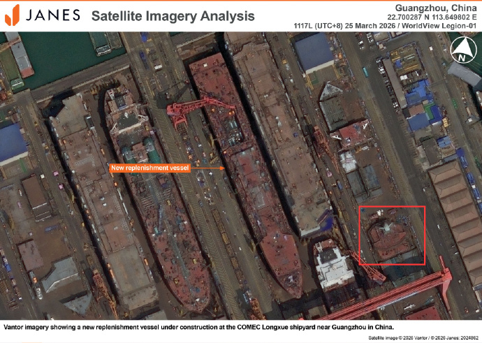 4月9日,英国《简氏防务周刊》网站披露:卫星图像显示黄埔文冲龙穴造船厂正在建造一艘疑似新型大型补给舰。这艘长达271米、宽约37米的巨舰,一旦建成服役,将为航母编队的远洋征程注入一剂“强心针”。