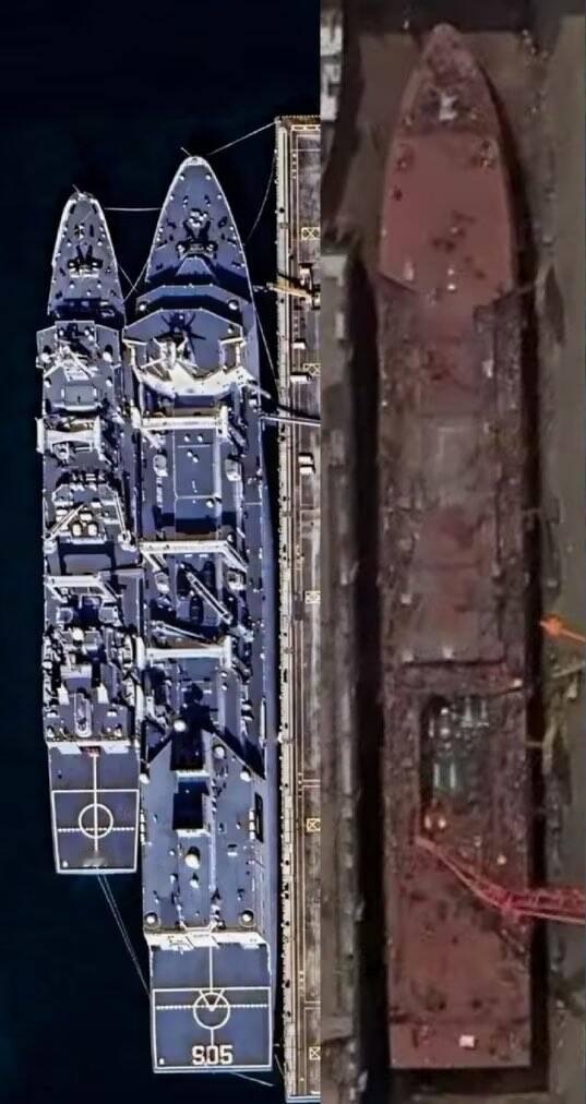 龙穴造船厂制造的这个补给船,舰体宽大、侧面平直、中段丰满,这是专为航母打击群运载燃油、干货和弹药的大型舰队辅助舰的典型特征,其设计优先考虑装载容积而非航速。