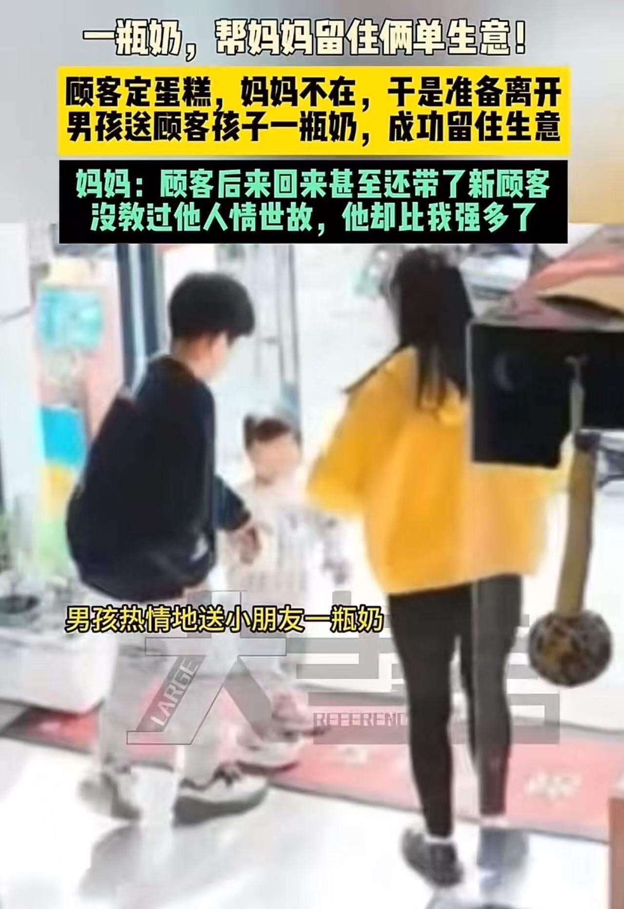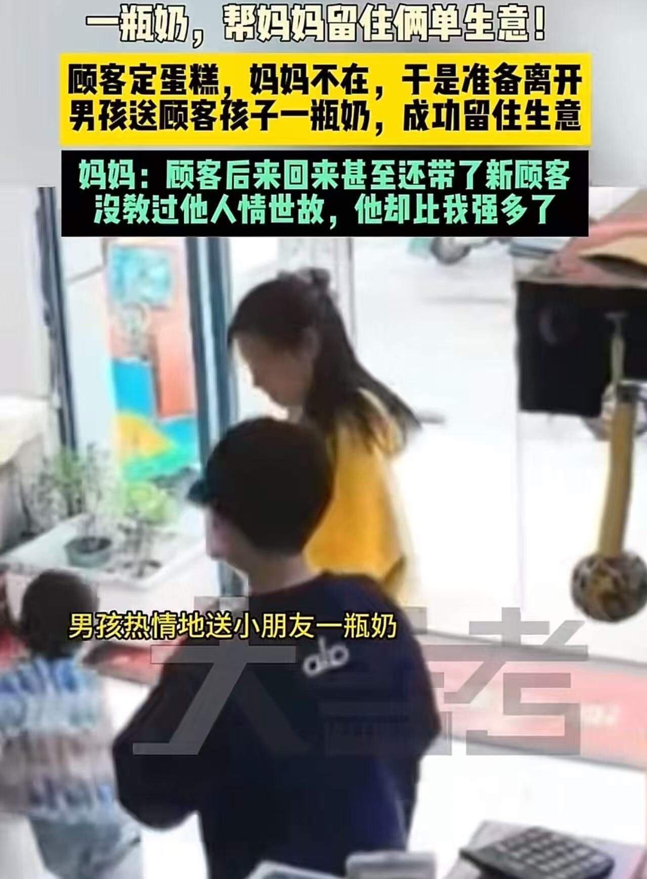 “这孩子真会做生意,比许多大人强多了!”湖北黄冈,男孩帮妈妈看店,顾客要定蛋糕,看大人不在就要离开,男孩二话不说送给顾客孩子一瓶牛奶,成功留住顾客!妈妈:顾客后来回来甚至还带了新顾客,没教他人情世故,他却比我强多了!