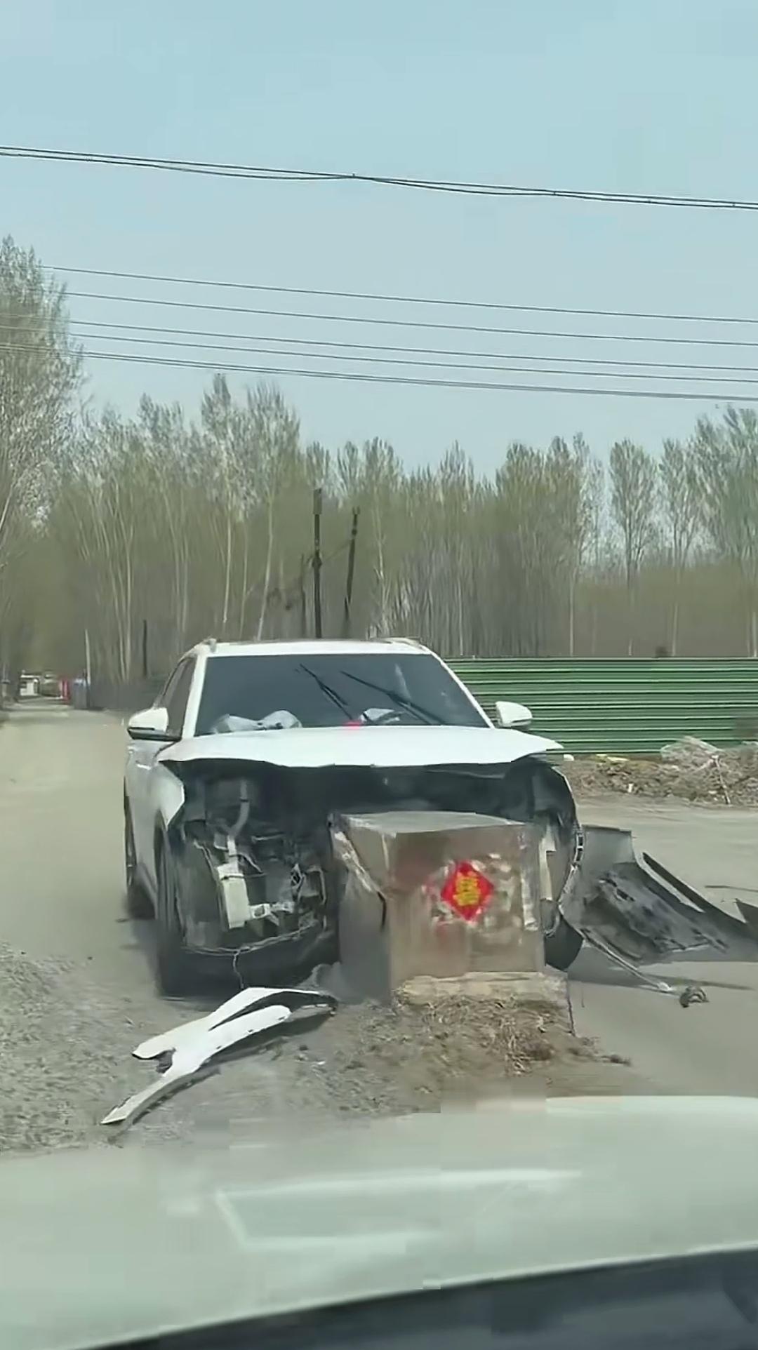 瞧这画面,着实令人痛心。一辆车径直撞上了路中央的石墩,车头撞得七零八落,司机也不见踪影。