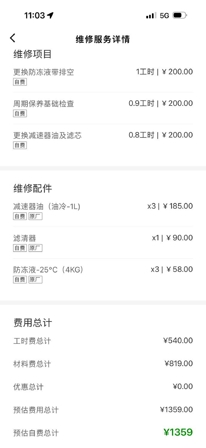 主要就三个项目,第1个就是更换了减速器油,其实减速器也是电动汽车传动一部分,内部齿轮同样需要降温。第2个就是滤芯器,增程器需要更换滤芯器。第3个就是防冻液,电动汽车内部的电池,电机电控是需要散热的。其实相关的费用要比同价位的燃油车便宜了大概2/3左右。【来自懂车帝车友圈】
