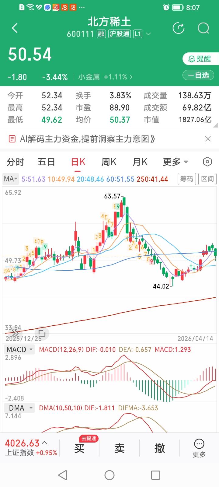 昨晚北方稀土披露了2026年一季报业绩预告,归母净利润同比大增109.14%—118.43%,业绩增长这么强劲,实指望今天股价会有所表现,谁知却让我大跌眼镜。