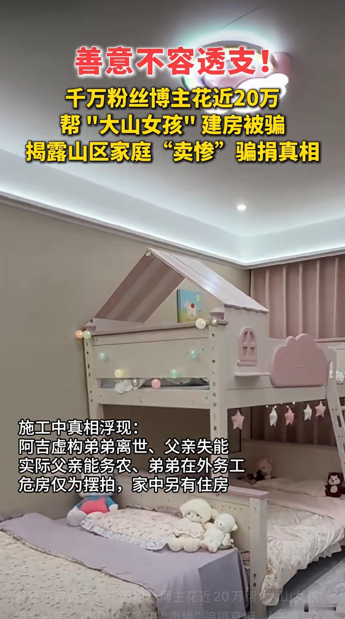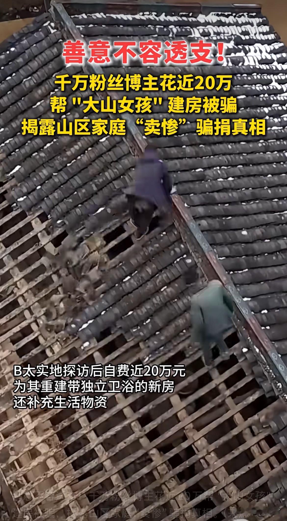 B太博主花了近20万想帮“大山女孩”建房,结果被骗得血本无归。这背后是部分山区家庭“卖惨”骗捐的丑恶真相,现在网上有不少打着贫困旗号博同情的人,他们利用大家的善良敛财。B太本是一片好心,想为大山女孩改善生活,没想到被算计。这也给我们提了个醒,做慈善不能盲目,得擦亮眼睛。说不定那些所谓的“惨状”都是演出来的。