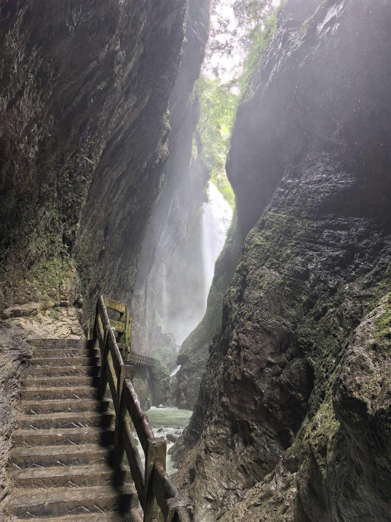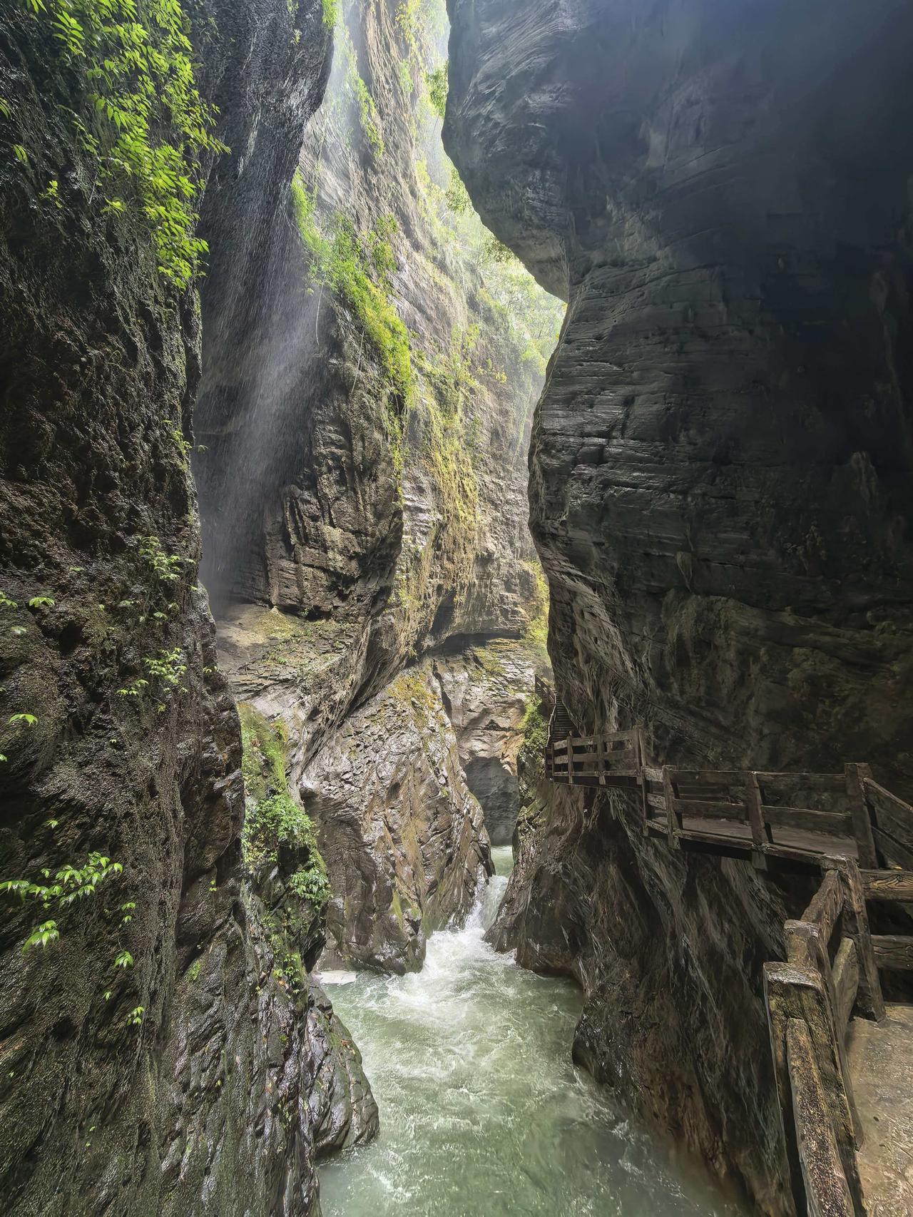 午后从天坑离去,搭乘15元/人的观光车返回换乘点,再转车前往龙水峡地缝。若说天坑是开阔雄奇,地缝便是幽深灵秀,宛如大地裂开的一道狭长秘境。自时光通道蜿蜒而下,乘电梯深入缝底,沿崖壁步道缓步前行,峡谷极窄,溪流奔涌,山泉自高处飞泻而下,形成多处灵动瀑布,水雾缭绕,清冽沁人。相较天坑的热闹,此处游人稀少,更添几分清幽静谧。