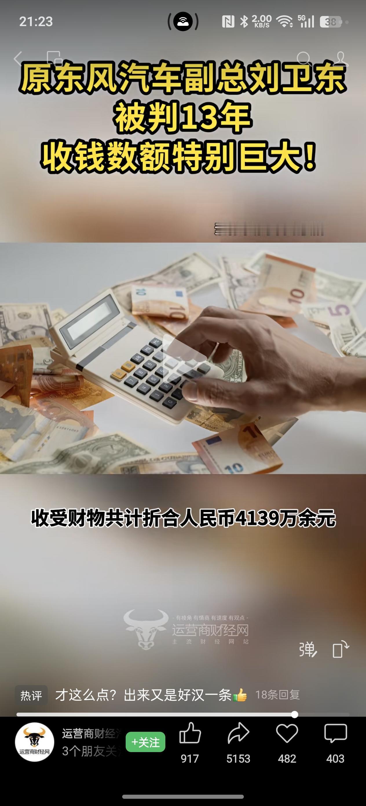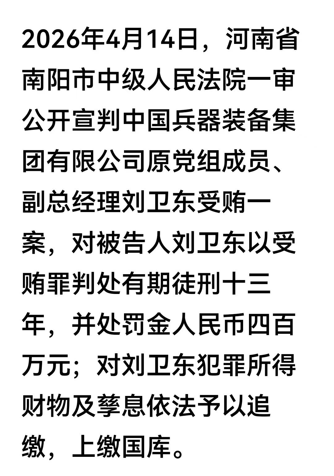刘卫东受贿一案终于一审宣判。这个国企蛀虫收受财物共计折合人民币4139万余元。一审被判处有期徒刑13年,并处罚金人民币四百万元。