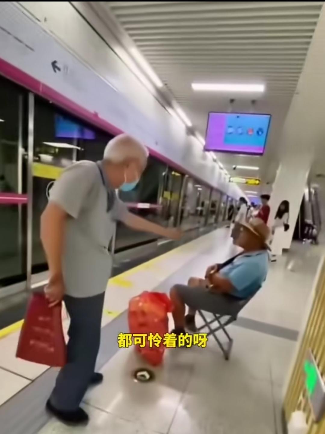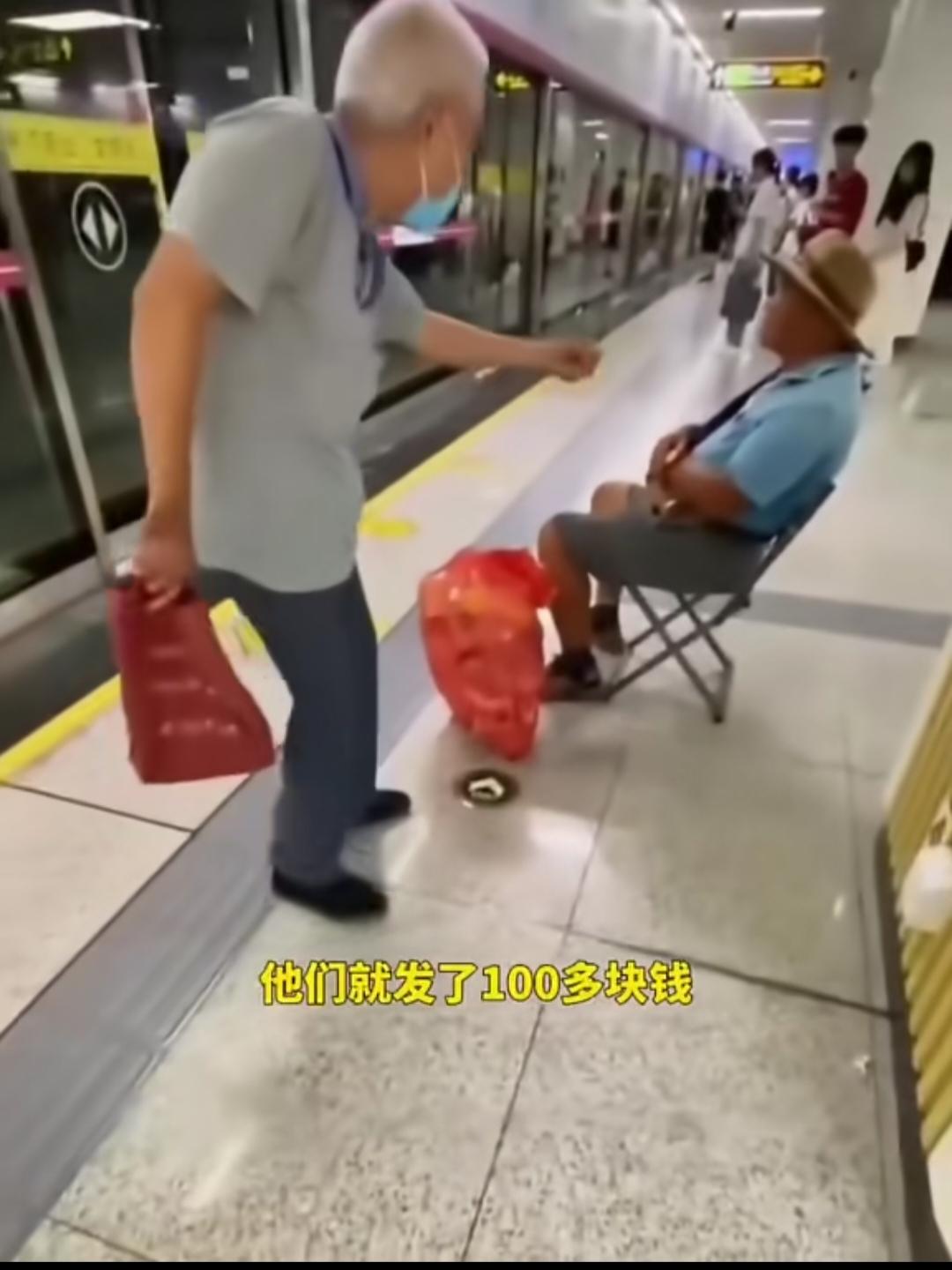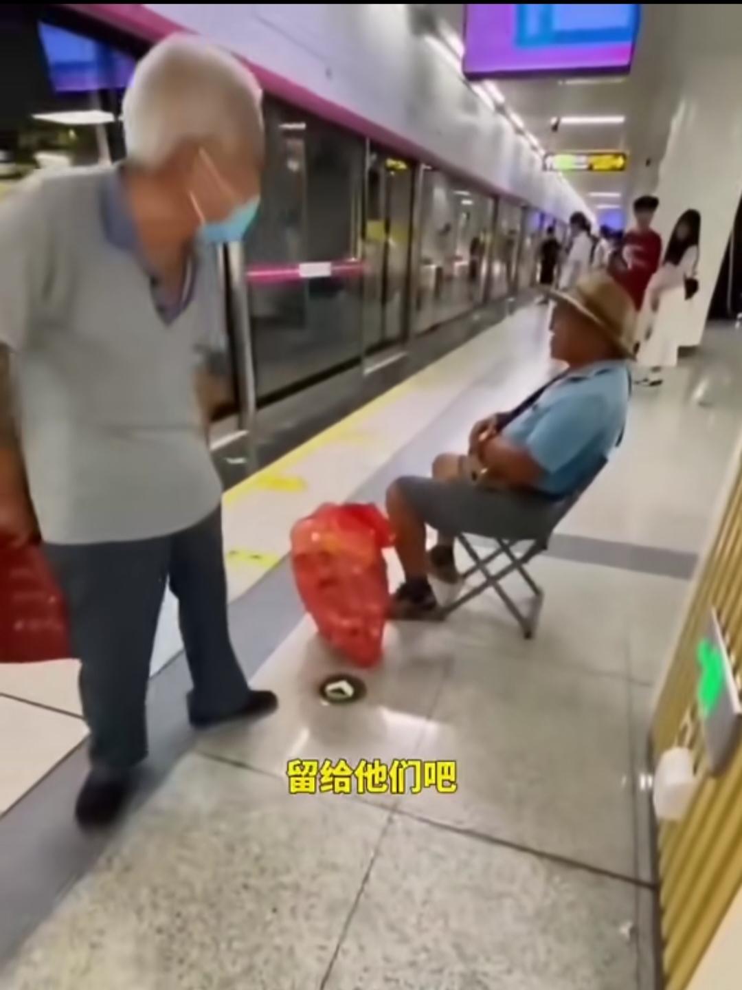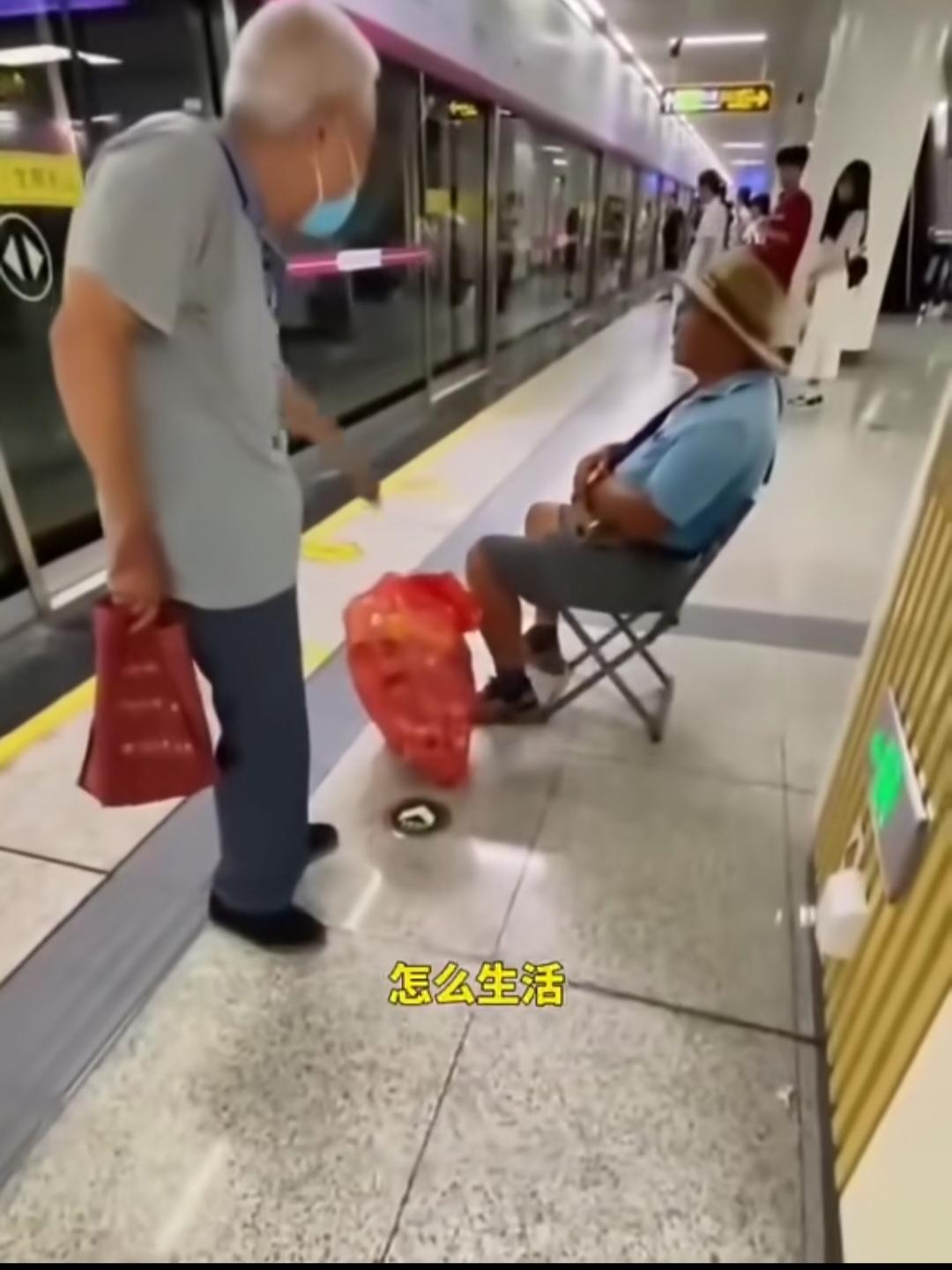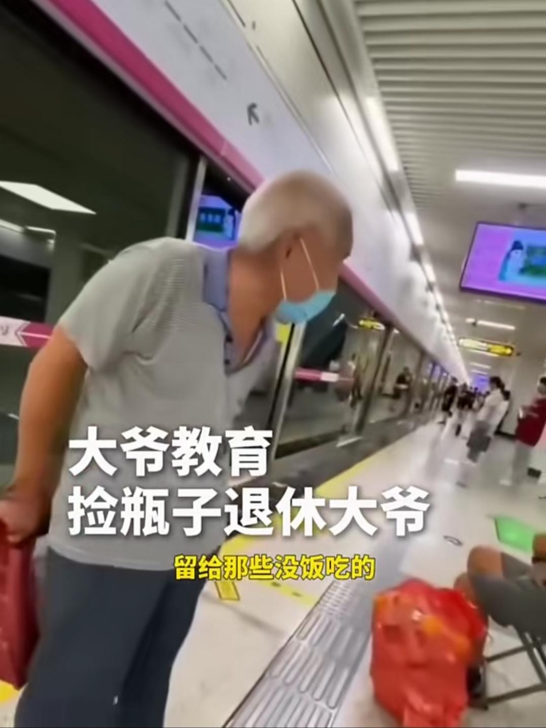 地铁站台,一位头戴渔夫帽,身穿天蓝色短袖的大爷,正大大咧咧的坐在自带的椅子上,身边摆放着一个红色的大塑料袋,塑料袋中是他捡到的各种饮料瓶子。