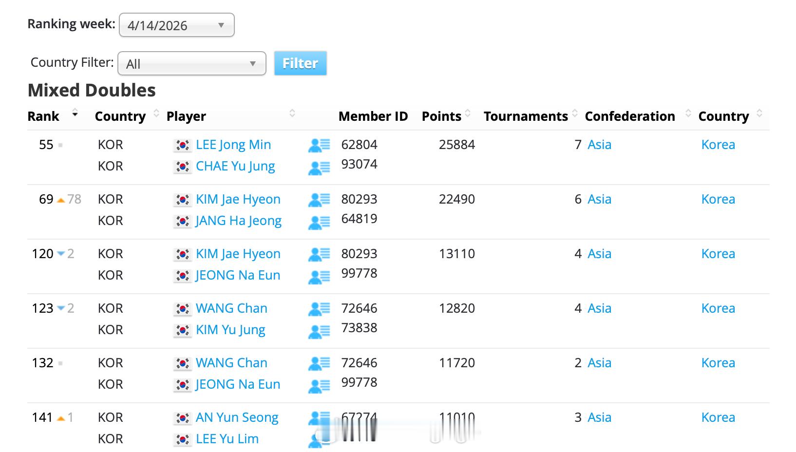 在2026年羽毛球亚锦赛 夺冠后,🇰🇷混双金在贤/张荷贞的世界排名蹿升78位,目前排名第69位,不过他们的排名还未超过蔡侑玎/李钟民