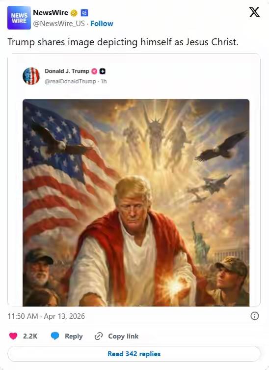 特朗普这番操作彻底突破美国政治与宗教底线,4月12日晚在Truth Social发布的AI耶稣图更是引爆舆论,画面中他身着红白长袍、掌心放光治愈病人,背景还混杂自由女神像与战斗机等美国符号 。教皇此前连续数周谴责美以挑起伊朗战争,甚至在复活节守夜弥撒痛批“全能错觉”,这才招致特朗普疯狂反扑。