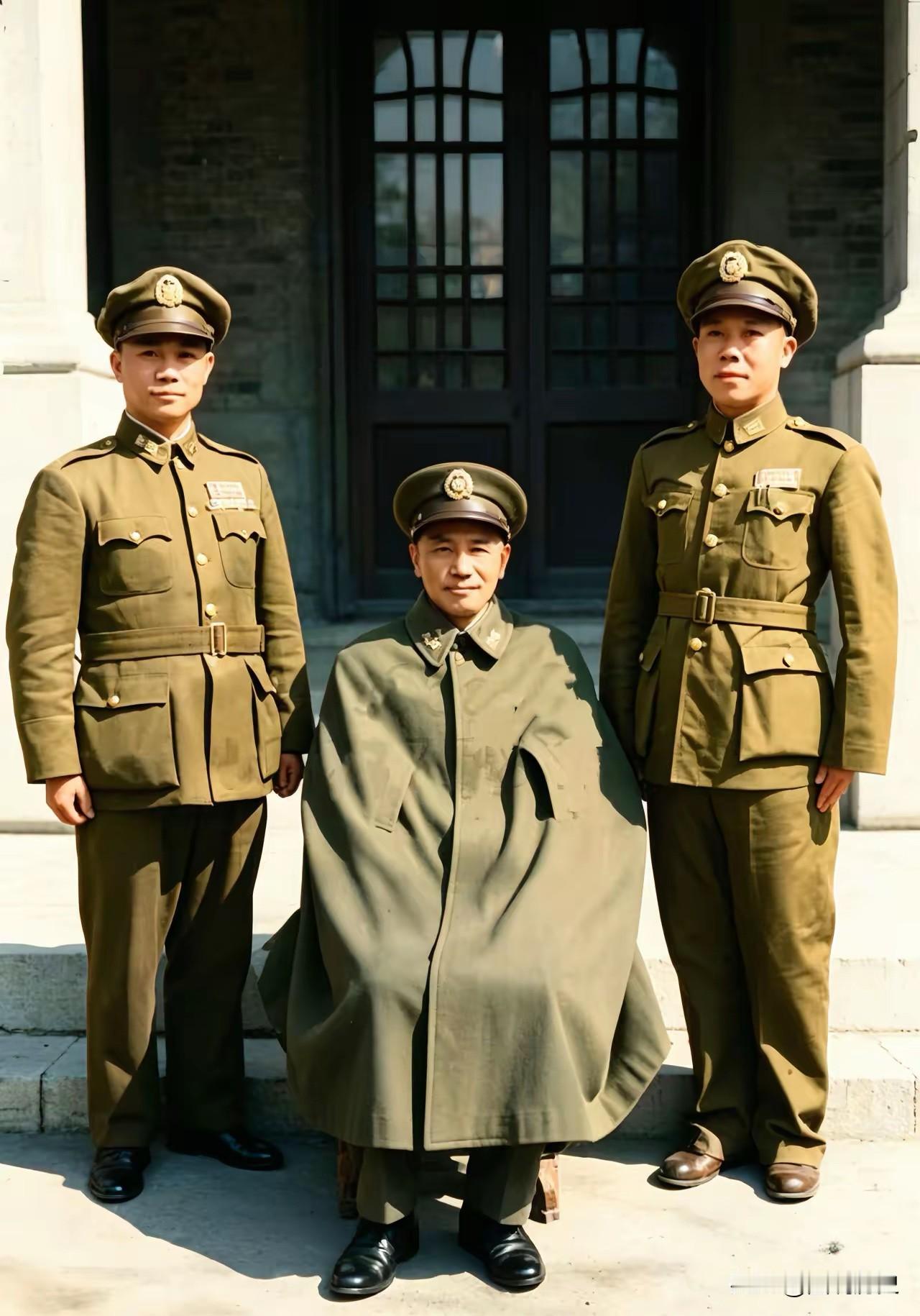 1947年,老蒋飞往济南城,在济南城视察期间的一张珍贵合影,但这张照片我没见过,我见过一张是王耀武和贺执圭站在老蒋的两边,而且老蒋没穿披风,所以我严重怀疑这张合影的真实性,而且这张合影老蒋身边的两个人是谁?左边的好像是陈诚,但右边的我真的没认出来!