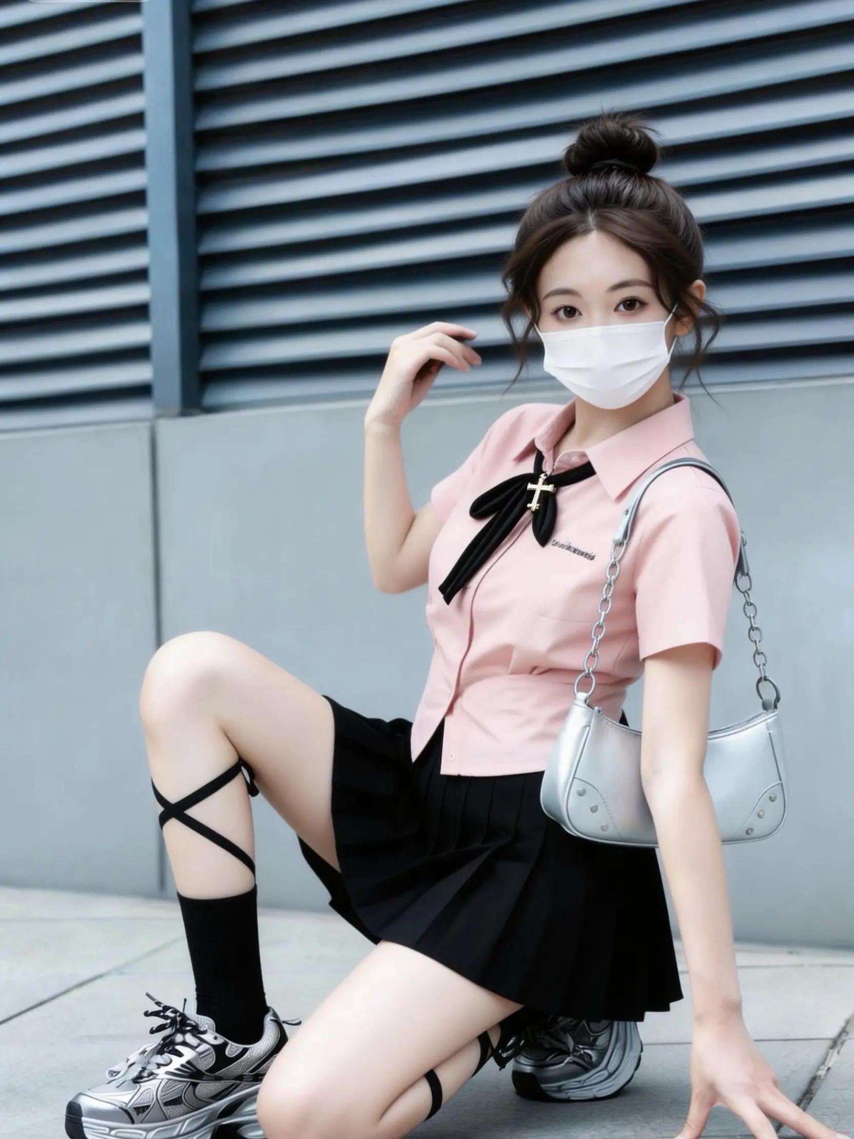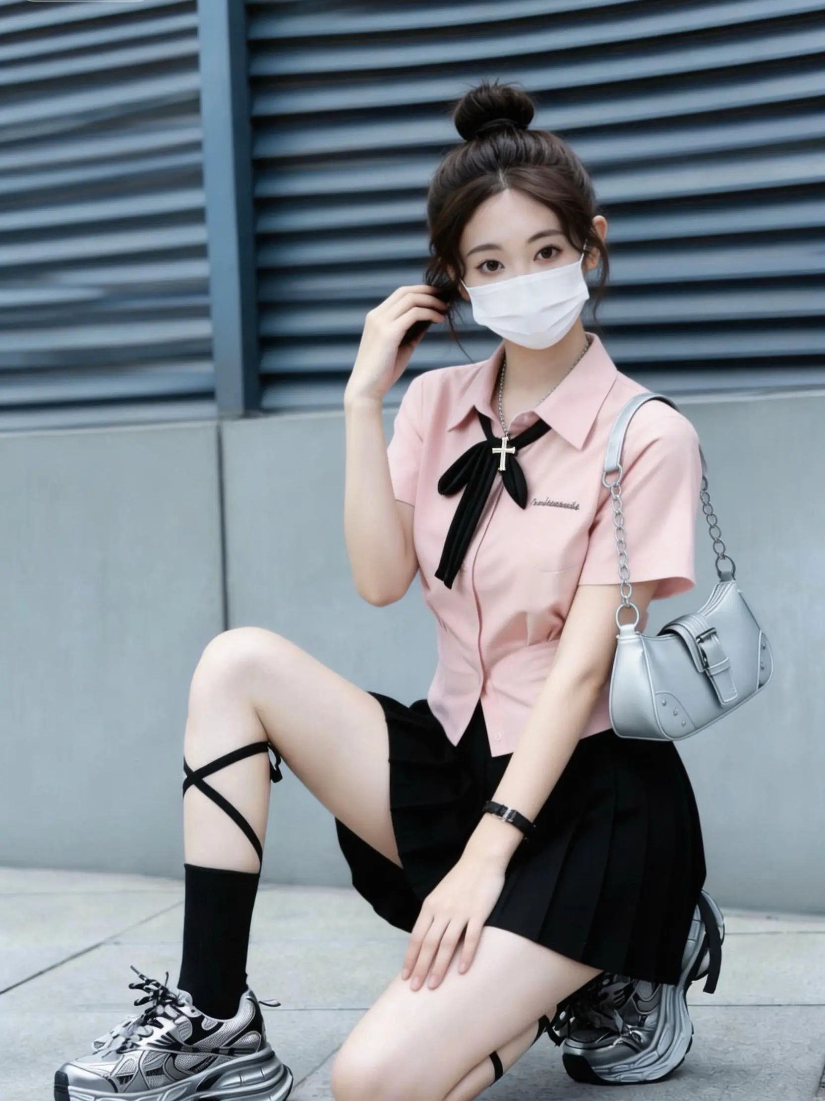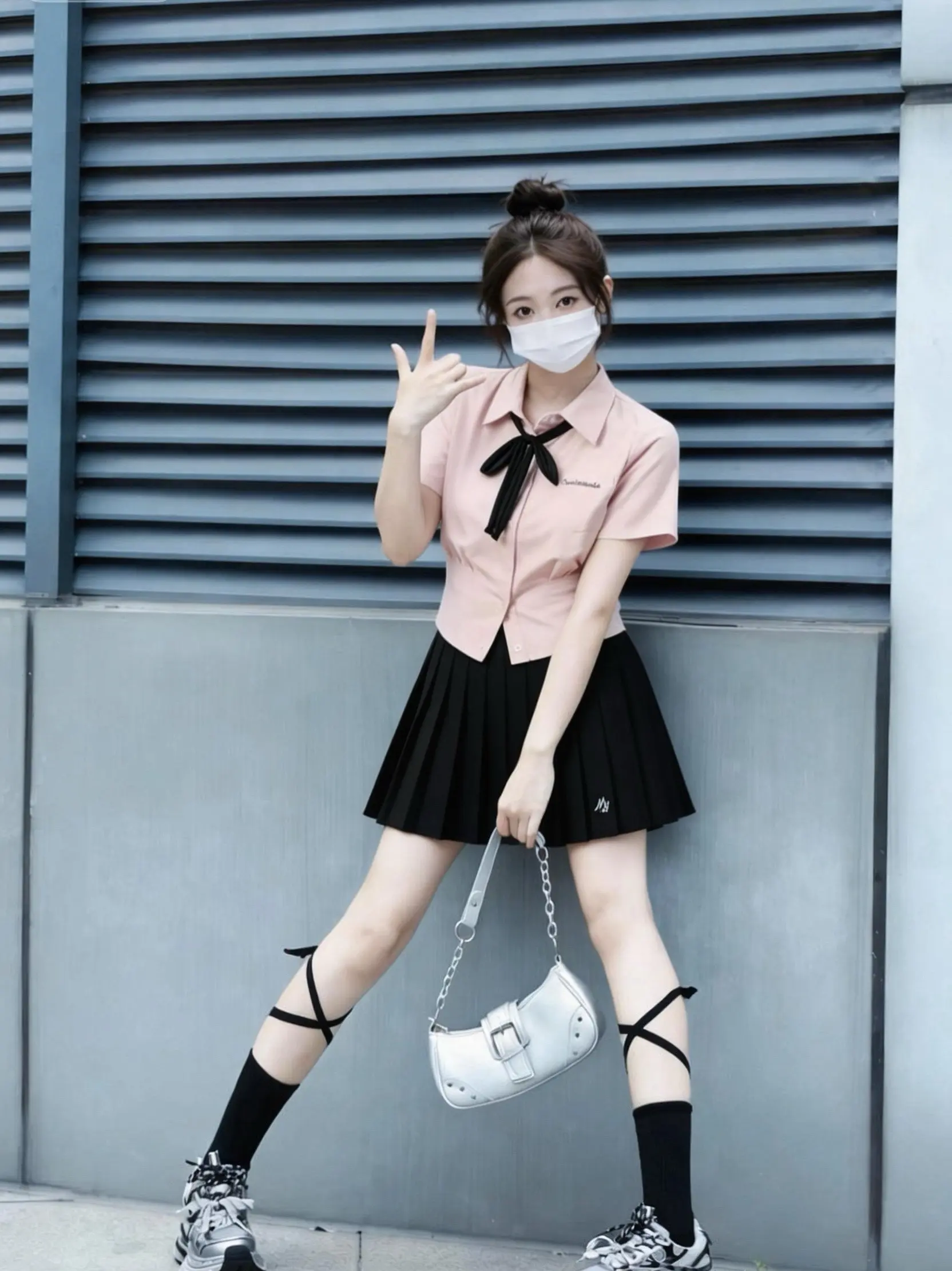 温柔粉衬衫搭配黑色领结,学院感直接拉满,