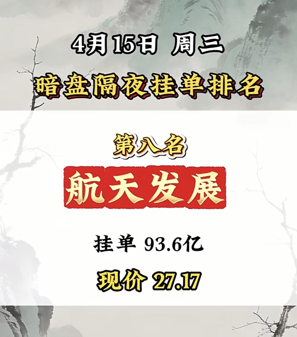 4月15日暗盘隔夜挂单航天发展排第八,现价27.17,感觉这是个投资机会啊!之前3月9日周一暗盘隔夜挂单前十名单出来时,短线圈都炸锅了,算力、电力等主线霸屏。像华胜天成是算力租赁真龙头,有华为昇腾和火山引擎加持,暗盘有53.27亿挂单,但也有资金分歧。