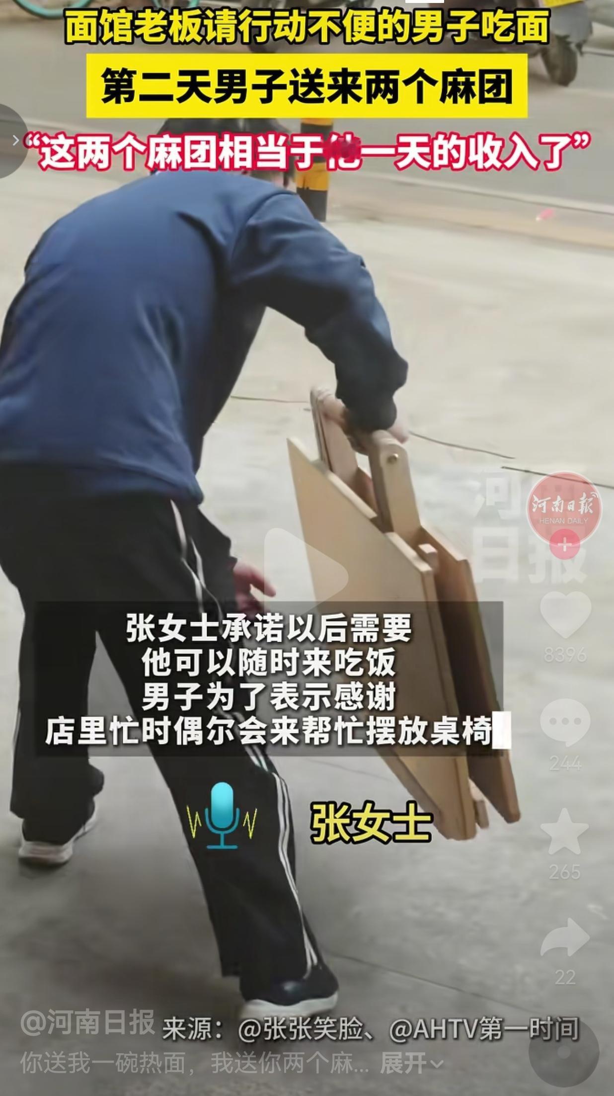 面馆老板免费请行动不便男子吃面,男子次日送来两个麻团,相当于他一天的收入。