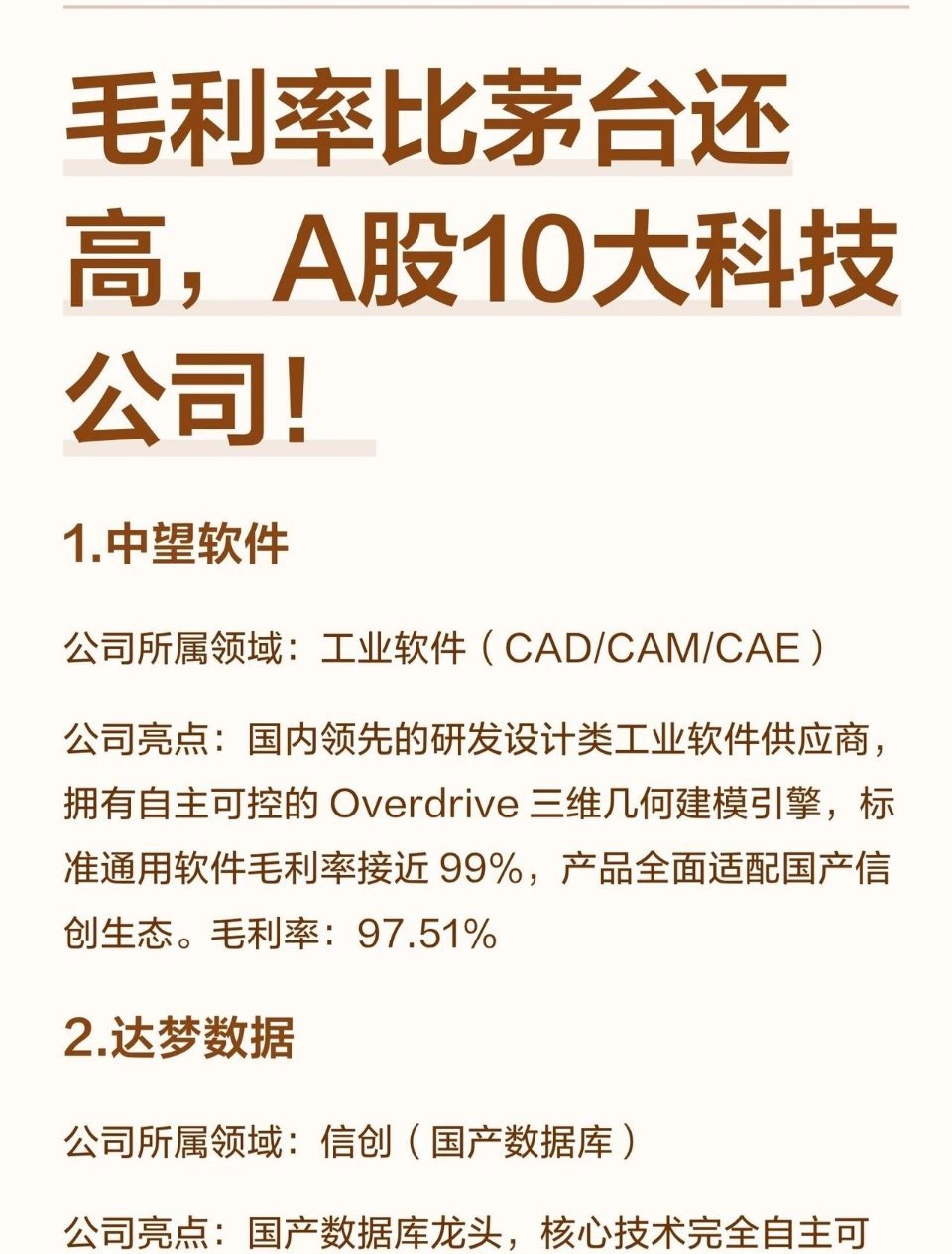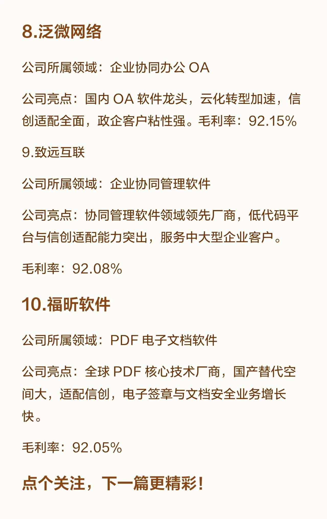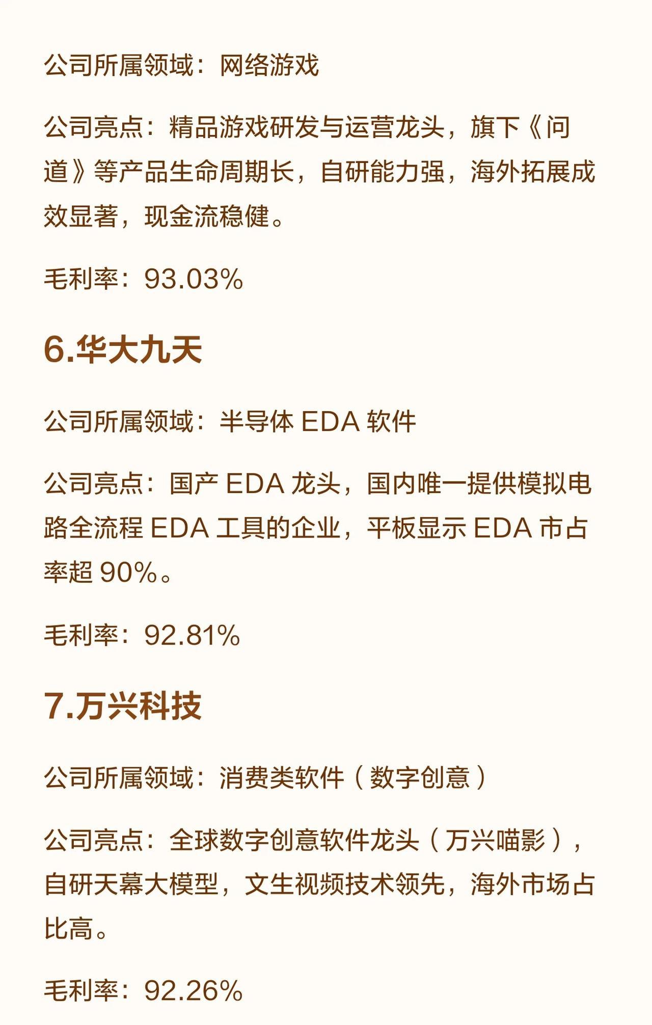 A股10大高毛利科技公司的核心信息总结(按序号排列):