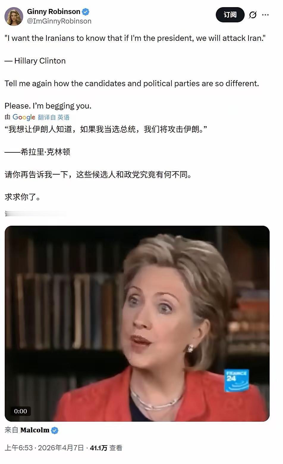 美国前国务卿克林顿.希拉里今天(4月14日)表示:“我是以色列的坚定支持者,同时又是本雅明.内塔尼亚胡的坚定反对者。他破坏了以色列的长期安全,我对当前局势深感担忧。当有人说‘如果你亲以色列、支持以色列,就必须支持内塔尼亚胡’,我会说:‘你听着,我爱美国,但我坚决反对特朗普。这会让我变成反美人士吗?我不这么认为’。”