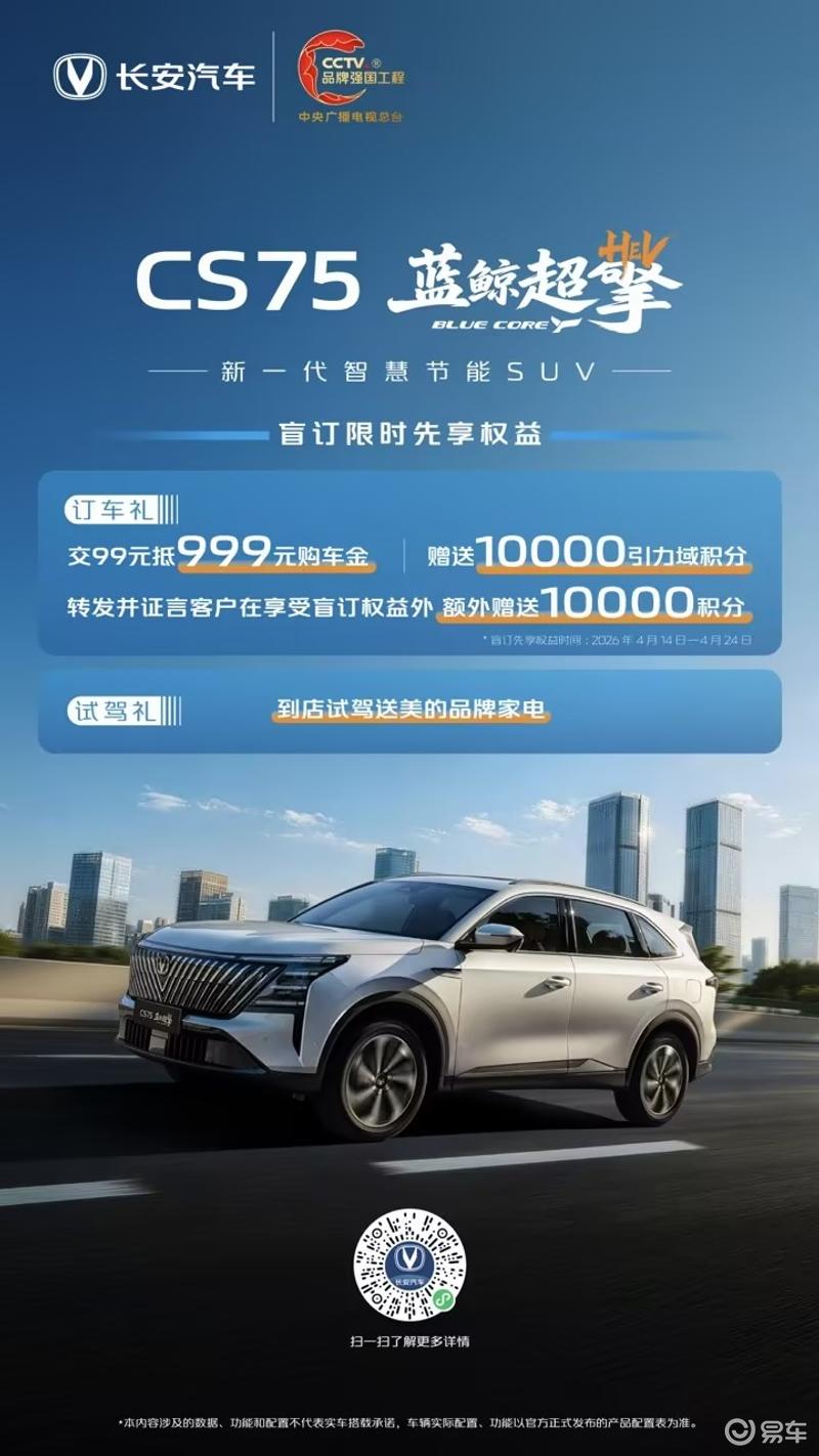 易车讯4月14日,长安汽车正式发布第四代CS75PLUS蓝鲸超擎配置,同步开启盲订,预订用户可限时享受:试驾送美的品牌家电、享交99元抵999元购车金、赠送10000引力域积分以及客户在社交平台发布提车作业再享额外赠送10000引力域积分的四大购车礼遇(具体活动细则以引力域APP为准)。第四代CS75PLUS蓝鲸超擎官宣定档4月24日北京国际车展全球发布。