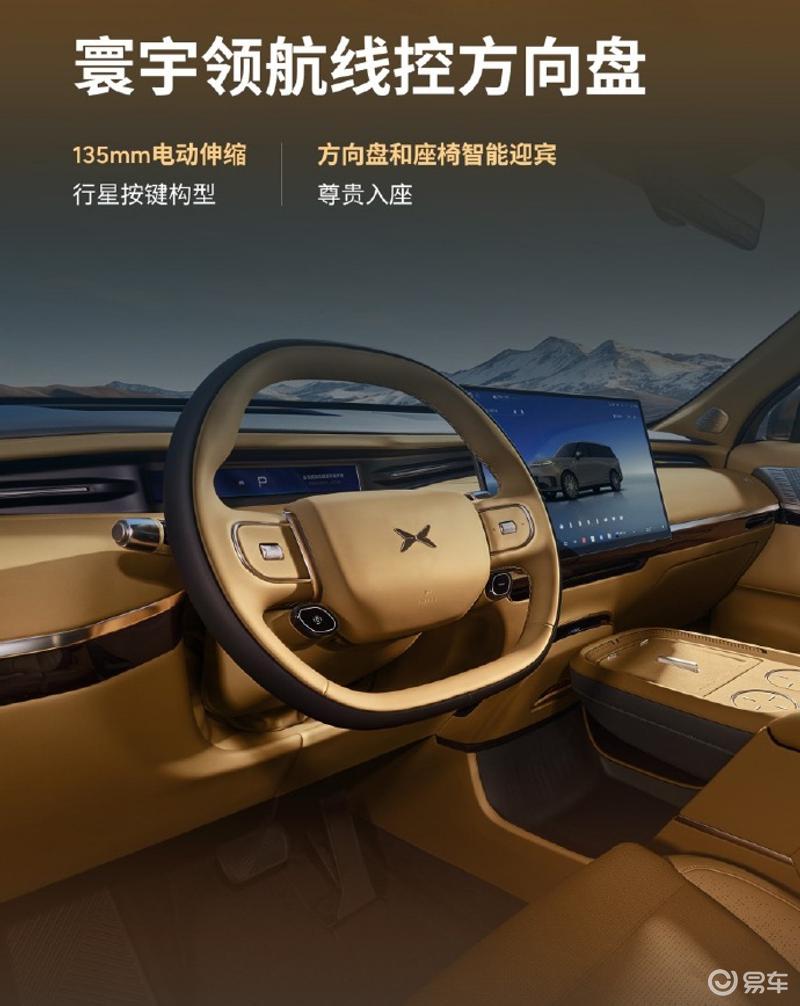 内饰方面,小鹏GX采用寰宇量子设计理念,营造出飞机头等舱的驾乘体验。新车搭载寰宇领航线控方向盘,且方向盘和座椅均带有智能迎宾功能,可进行135mm电动伸缩,并采用行星按键构型。中控台搭载17.3英寸3K超窄边中控屏。