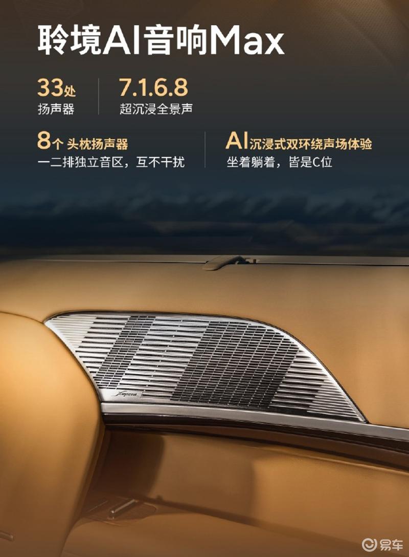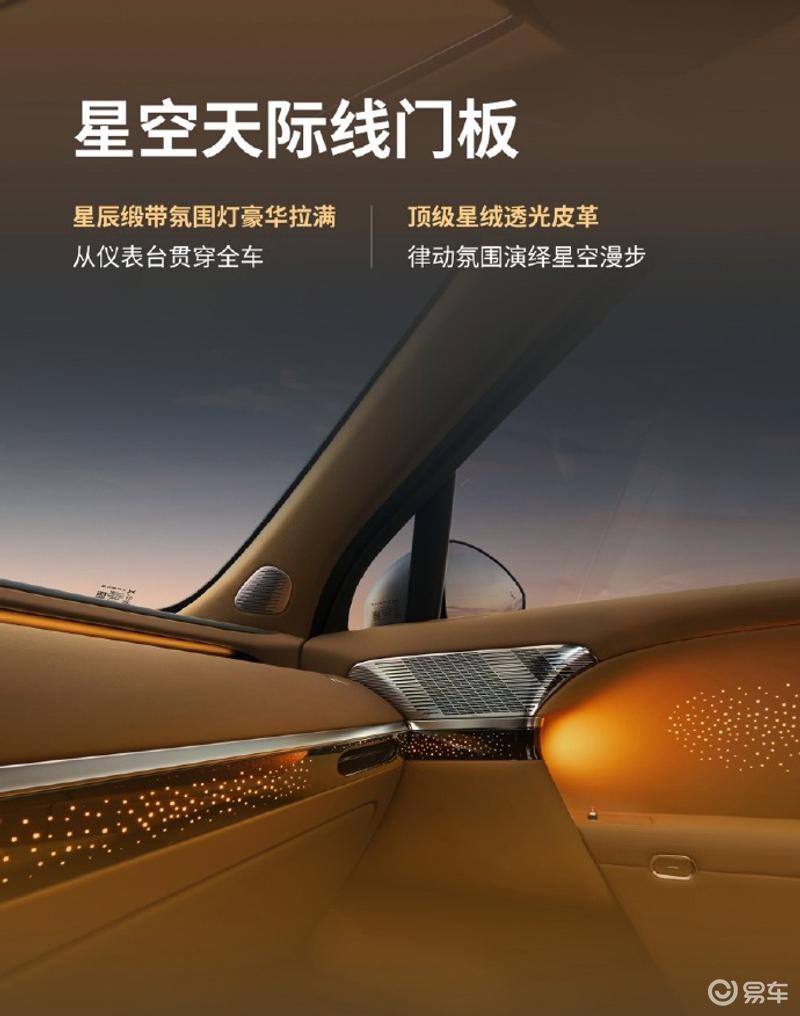 前排中央通道区域采用领航悬浮中岛设计,采用装饰性结合功能布置,拥有智能升降充电面板以及隐藏式升降杯托,提供更丰富的储物空间。新车采用星空天际线门板,采用顶级星绒透光皮革,配合星辰缎带氛围灯,进一步提升内饰的质感。娱乐性配置方面,小鹏GX搭载聆境AI音响Max,拥有33处扬声器。新车的二排搭载了独立零重力座椅,采用真皮打孔材质,并拥有丰富的按键功能以及腿拖。
