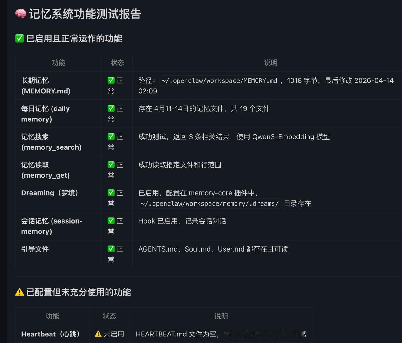 三,ai代理最重要的就是有记忆功能。折腾了十几天,大部分时间就是搞这个。现在大部分记忆插件都不是很完善,有些记忆插件甚至会伤害系统,最好慎用。其实现在openclaw原生记忆系统也很不错。