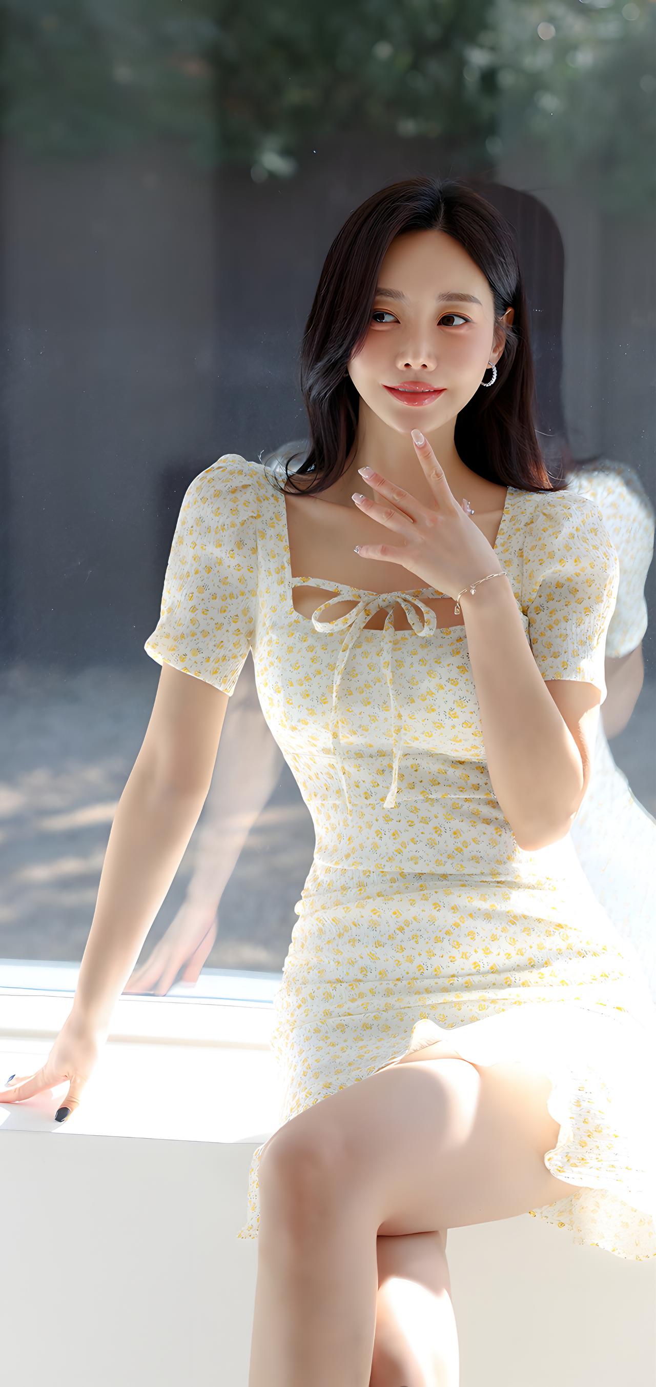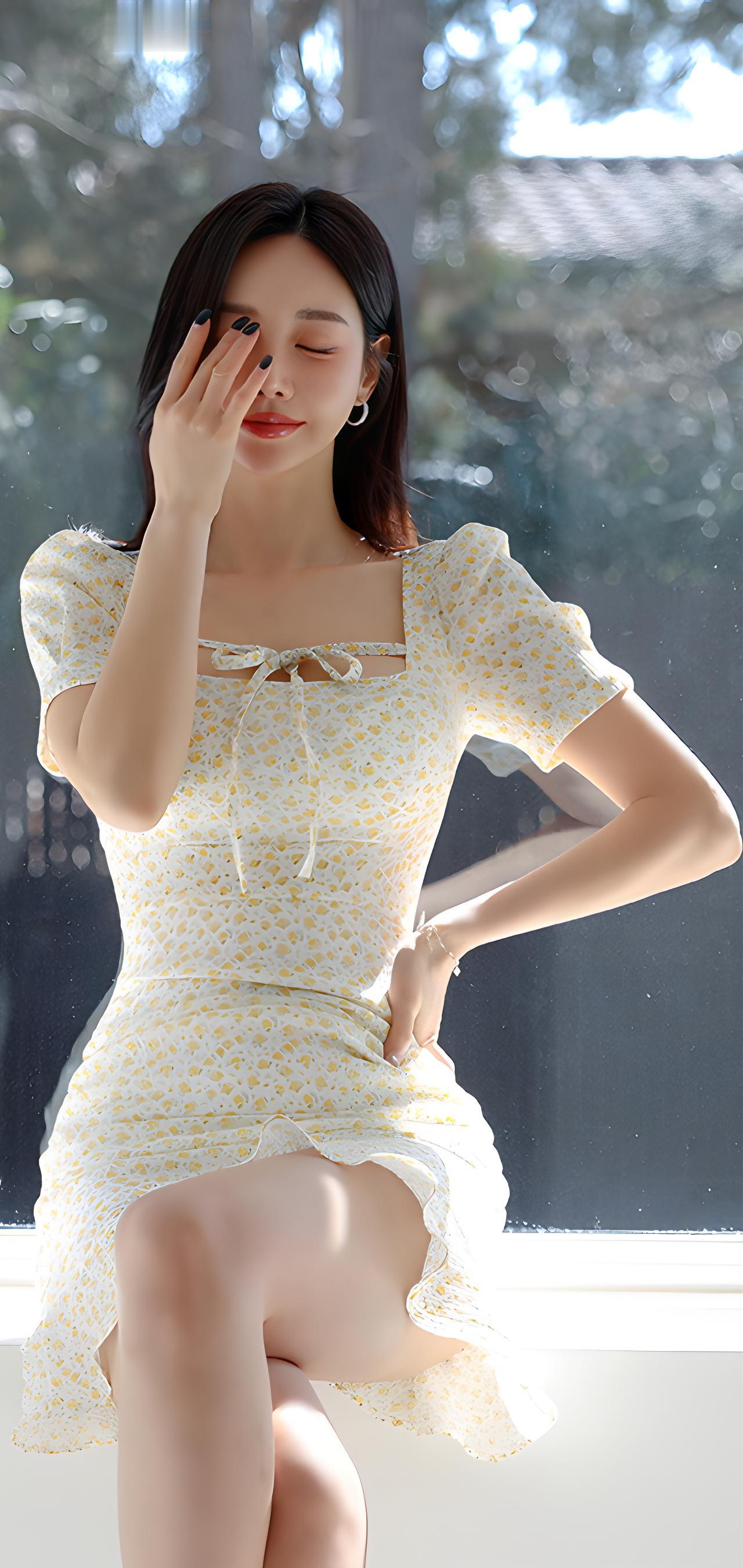 春日的暖阳洒在柔软的沙发上,碎花连衣裙与背景的温柔色调完美融合,仿佛一幅静谧的画