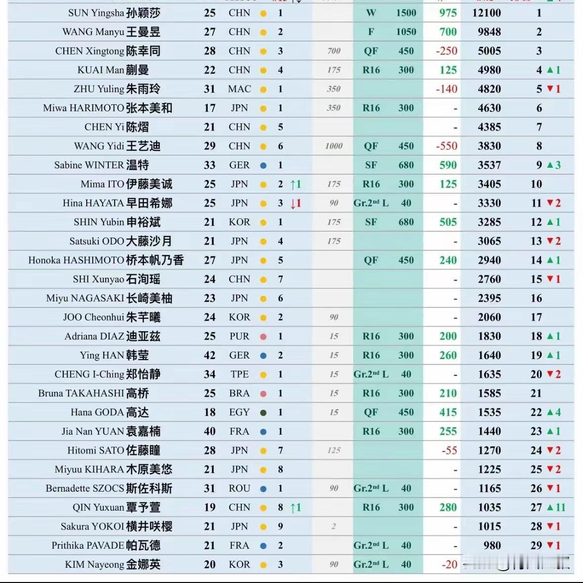 坏了!女乒积分大变动,蒯曼将降到世界第七,陈熠成为国乒四姐!