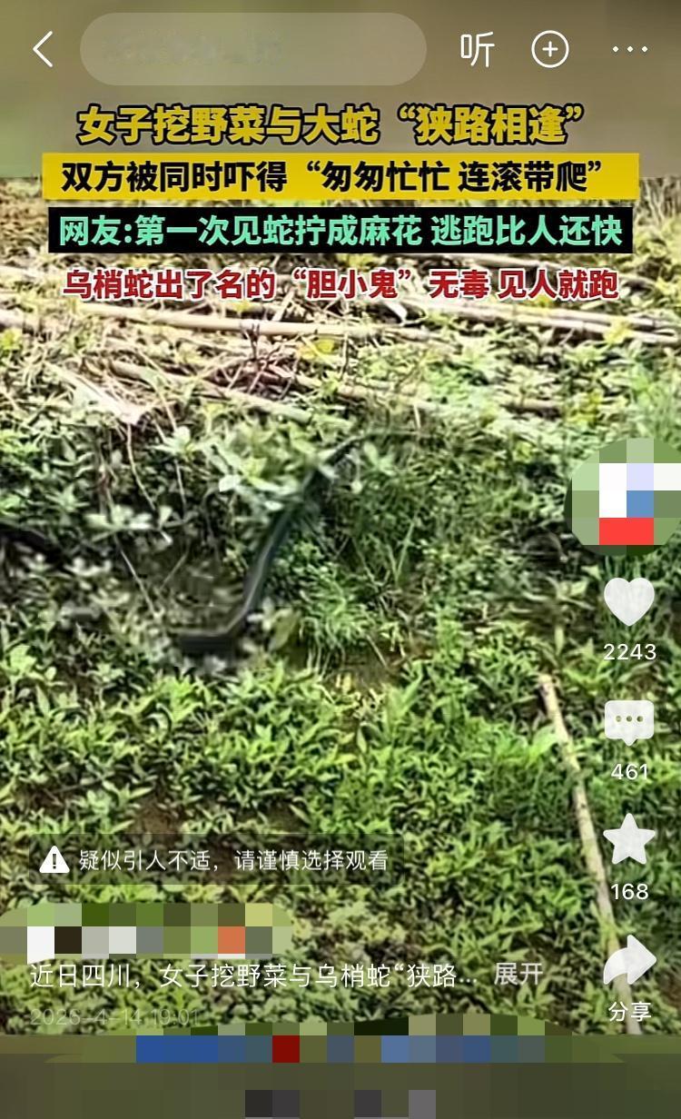 女子本来蹲在田埂边挖野菜,指尖刚碰到绿油油的荠菜,眼角余光就扫到身旁草窠里盘着条超长的大蛇。那蛇昂着头吐着信子,吓得她魂都飞了,连手里的菜篮子都没顾上捡,拔腿就往远处冲。慌慌张张的她脚下一滑,结结实实地摔在泥土里,沾了满身的草屑和泥巴。