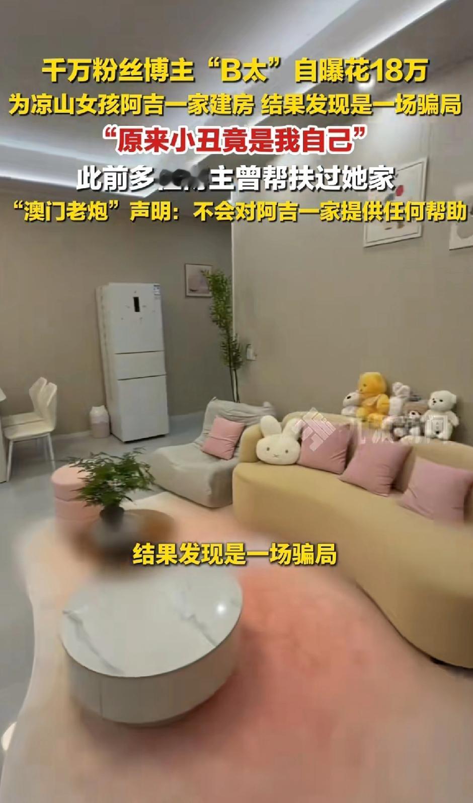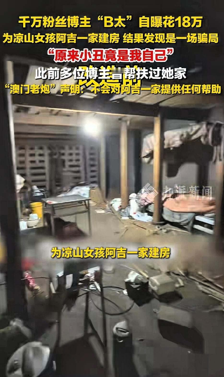 千万粉丝博主“B太”自爆花18万为凉山女孩阿吉一家建房,结果发现是一场骗局,自爆:原来小丑是我。此前多名博主帮助他们家,“澳门老炮”声明:不会再对阿吉家提供任何帮助了。