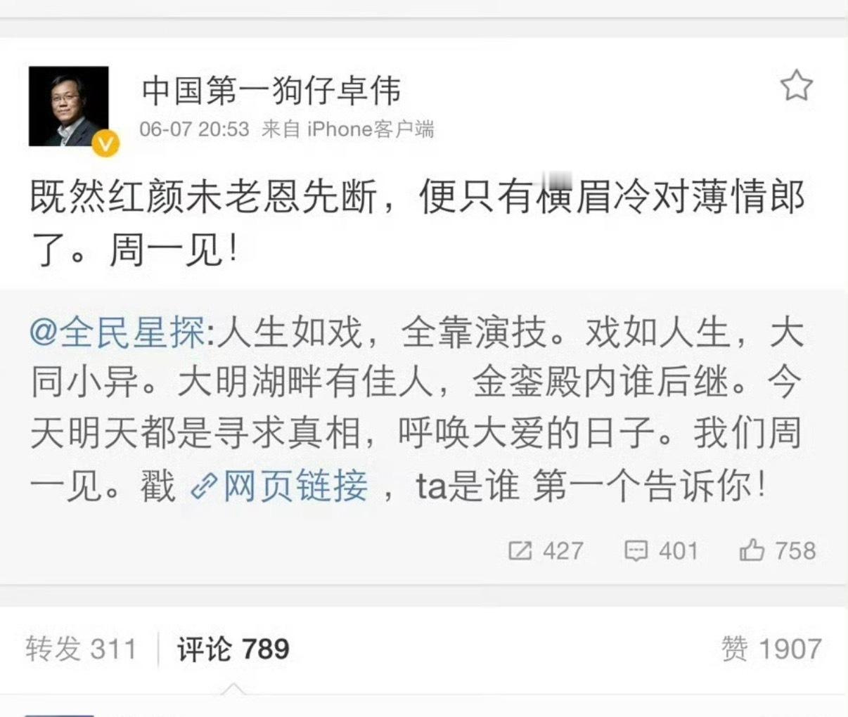 于是网友们都反应过来了当年狗仔卓伟发的“周一见”文章到现在都还怕了啊…