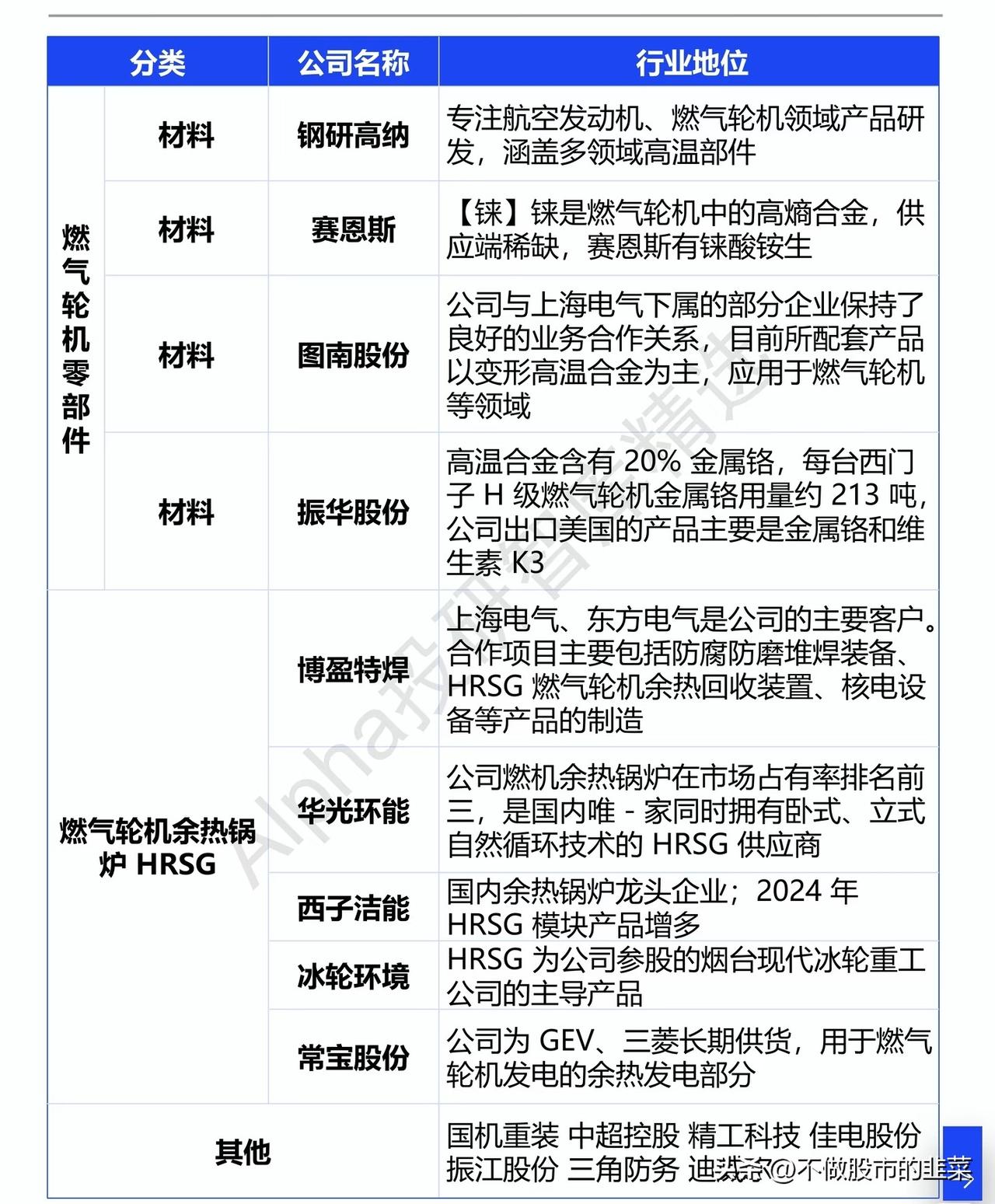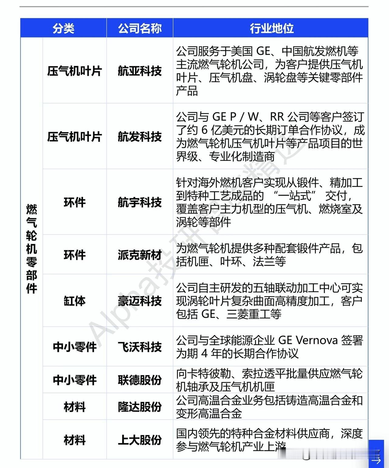 涡轮叶片是燃气轮机的“心脏”,航发动力、应流股份、万泽股份等企业掌握高温合金叶片核心技术,覆盖热端核心部件;压气机叶片、环件、缸体等环节,航亚科技、航发科技、航宇科技等企业深度绑定GE、三菱等全球龙头,订单稳定性强;材料端则是产业链的基石,隆达股份、上大股份、钢研高纳等企业掌握高温合金核心技术,是国产替代的基础保障。