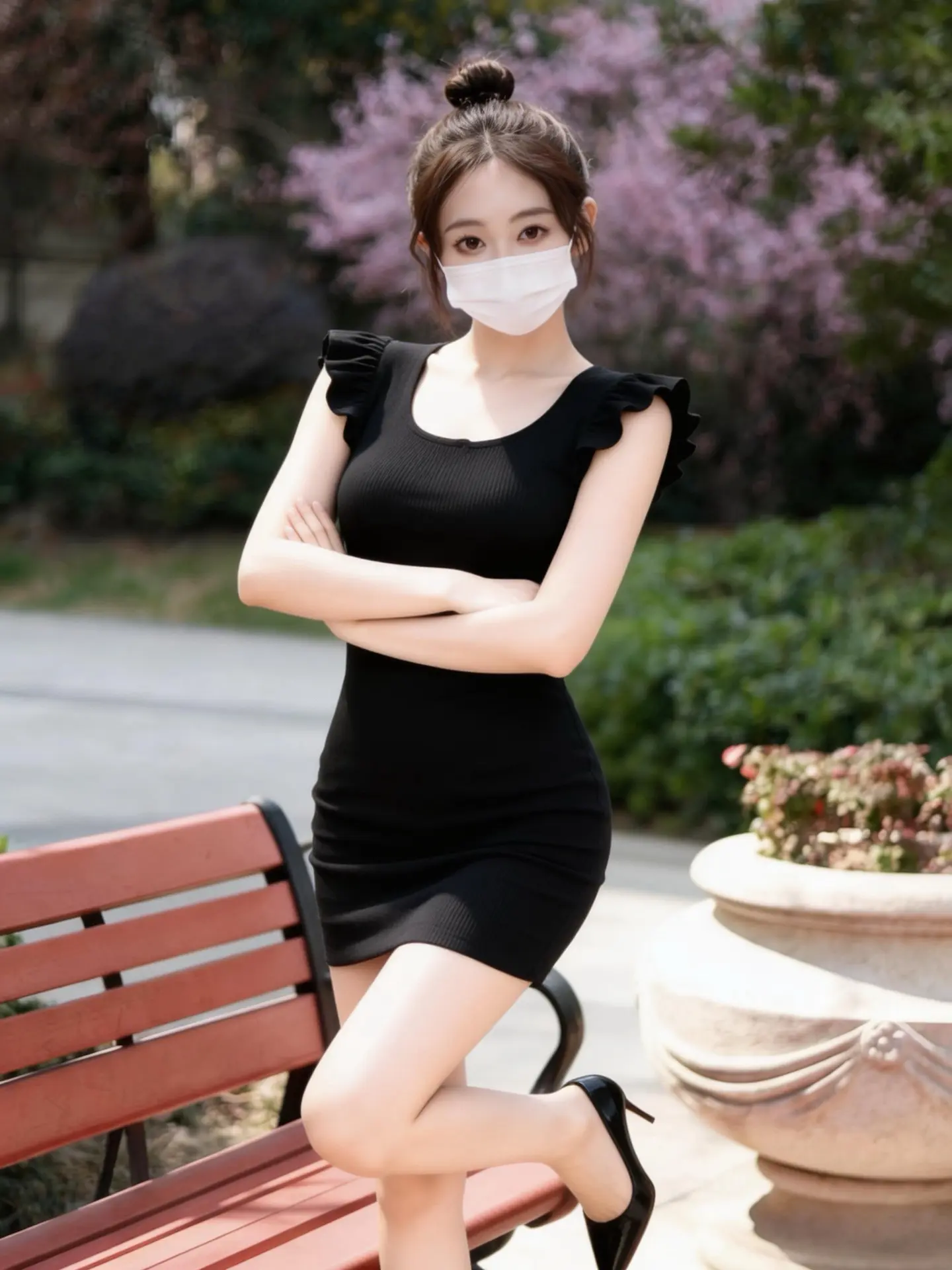 修身针织面料+木耳边设计,搭配丸子头和红底高跟鞋,又甜又御,在公园随便拍都出片~