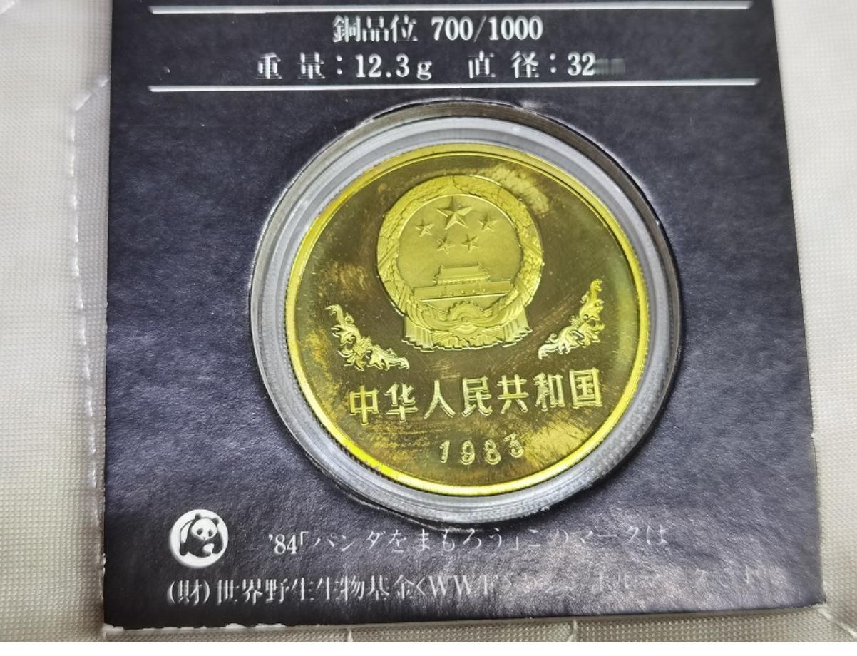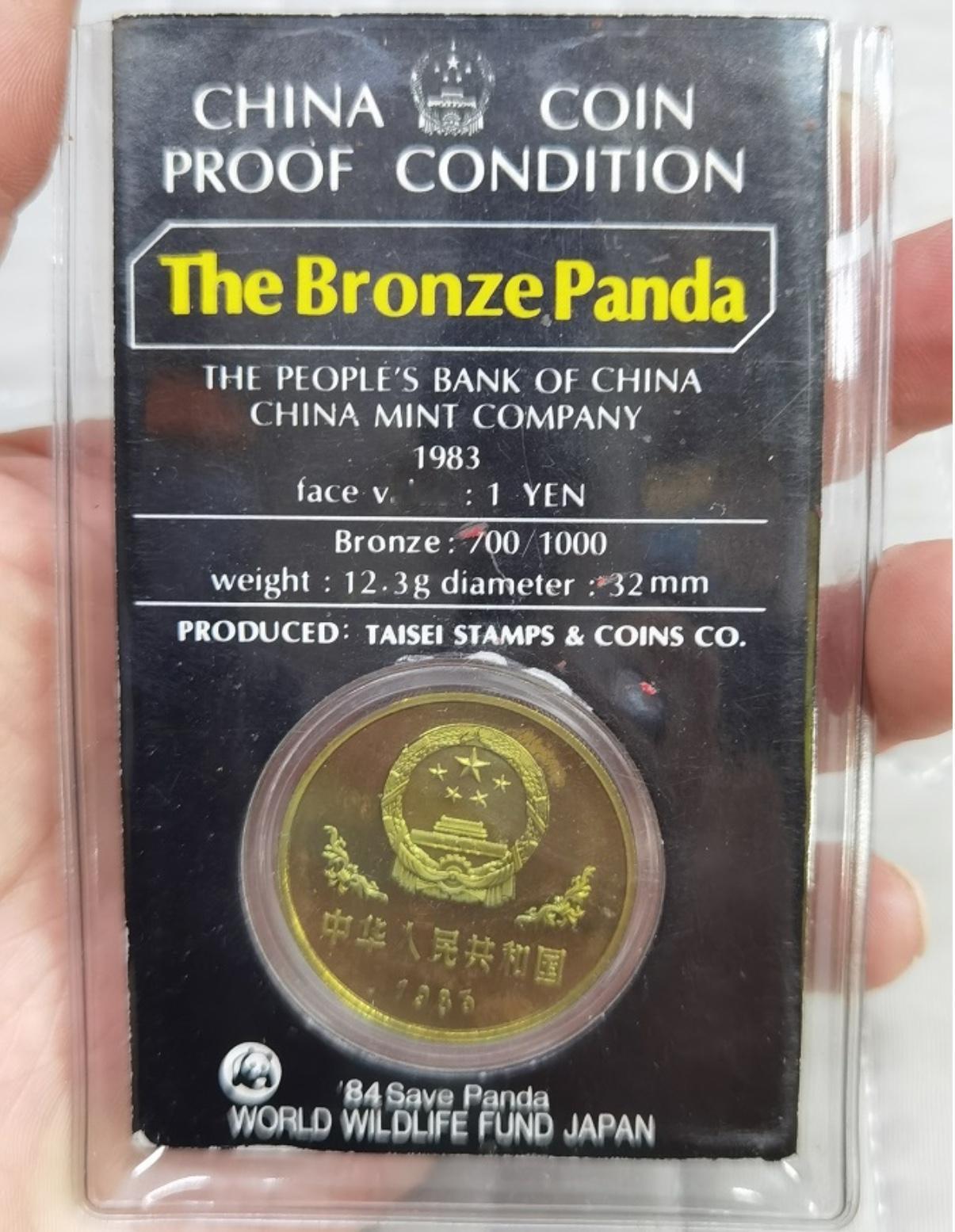 这是我在日本名古屋的一家钱币古玩店看到的,1983年的熊猫铜币。其正面是日文品名信息,背面是英文版的。