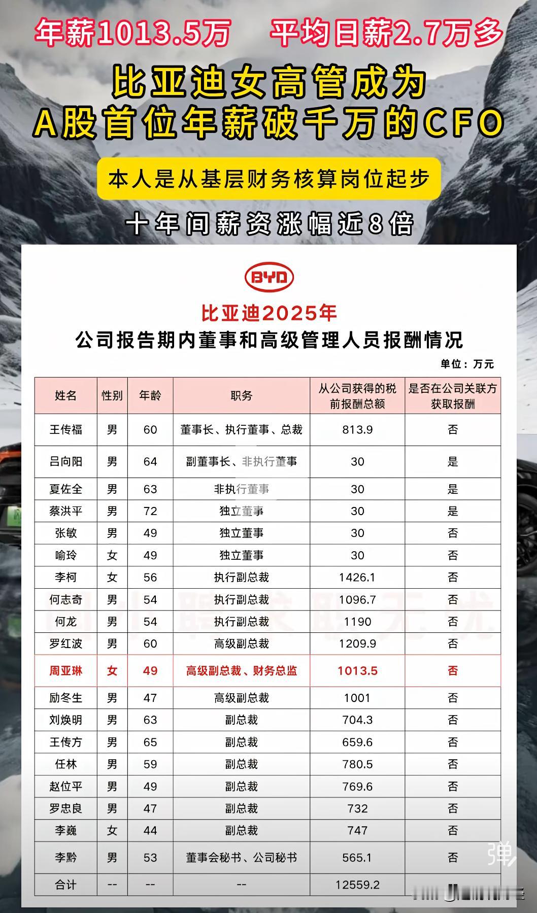 随着25年年报公布,CFO年薪也成为大家关心的话题。A股年薪千万的有三位。比亚迪