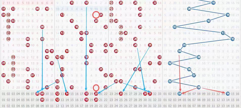 蓝球04/14,4尾的同尾号,04是走势图形对称,14是跨度对称,跨度6。