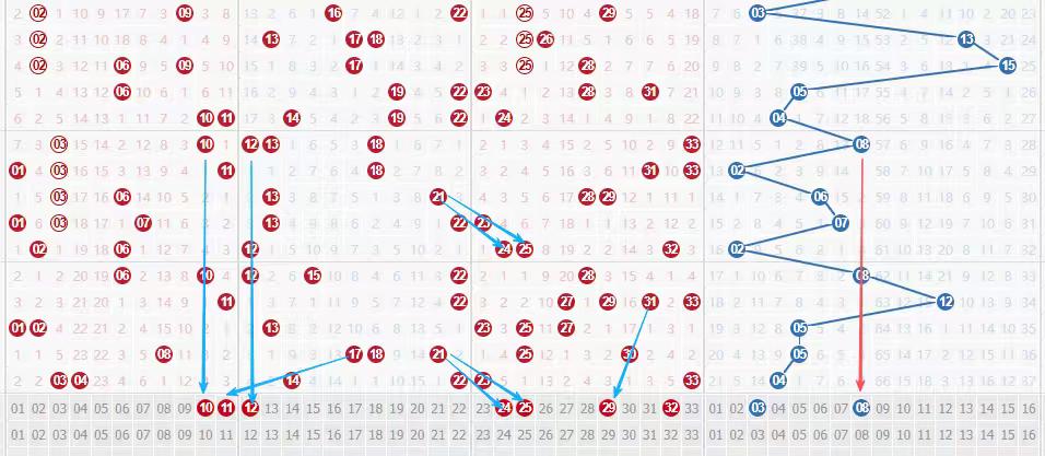 后面4个号码都是三区的了,连号24/25,出号规律跟前几期一样。图形对称了。经典的组合29/32,是我个人比较喜欢的。也有走势31-30-29,32邻号。
