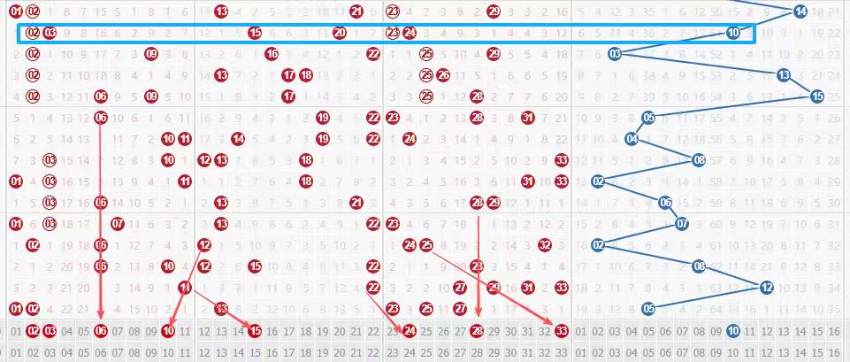 三区近两期开的都是单数的号码,选了几个数填空:24/28,33是回马枪+三期同跨度斜连。