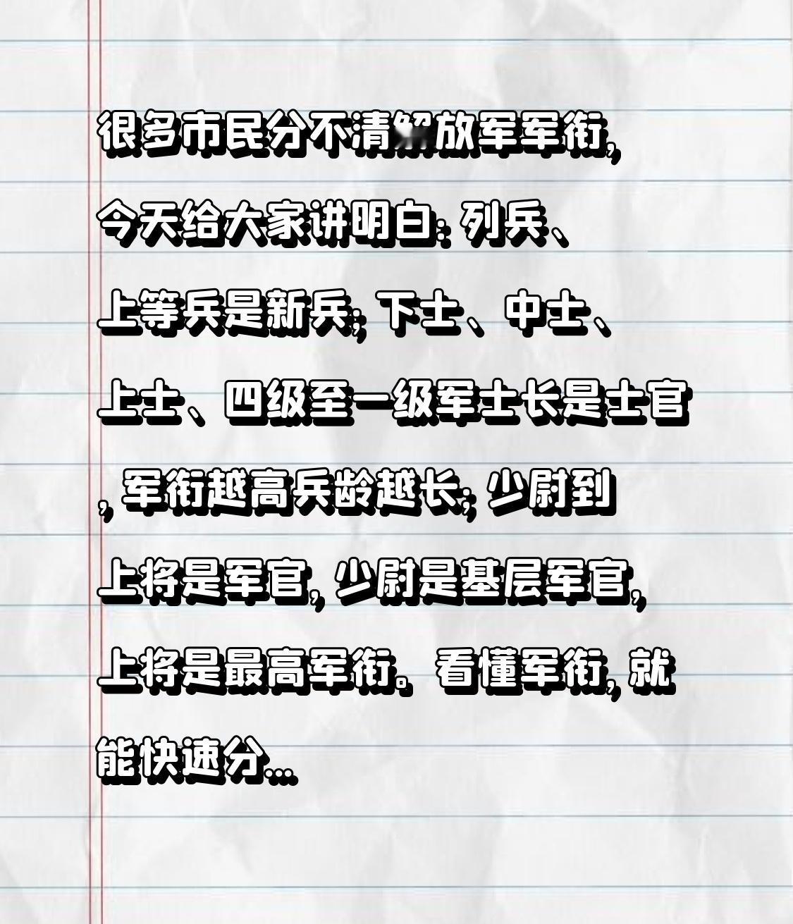 很多市民分不清解放军军衔,今天给大家讲明白:列兵、上等兵是新兵;下士、中士、上士、四级至一级军士长是士官,军衔越高兵龄越长;少尉到上将是军官,少尉是基层军官,上将是最高军衔。 看懂军衔,就能快速分清战士资历,涨知识了! 中国军衔 军事科普