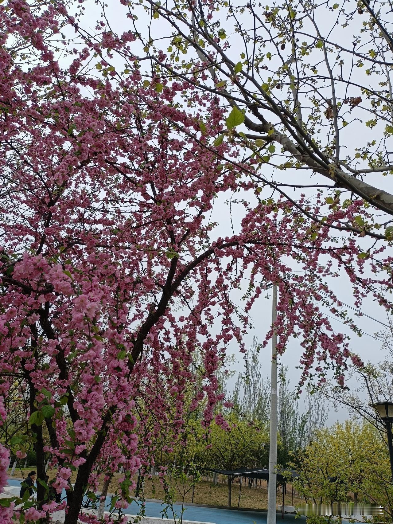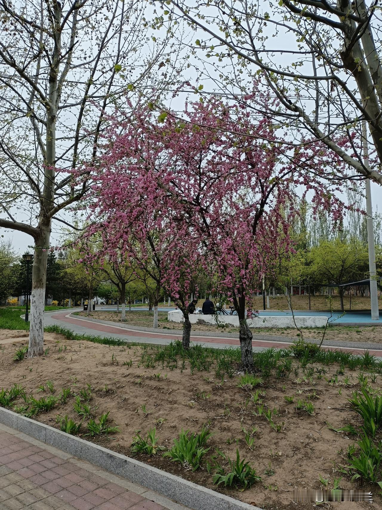 春天百花盛开,公园里的花开的特别热闹,有迎春花,还有粉色的桃花,红色的不知道是什么花,叫不上名字。