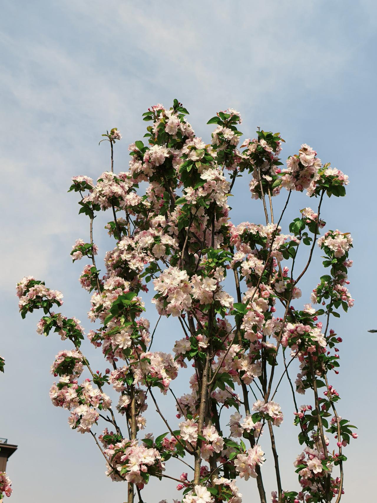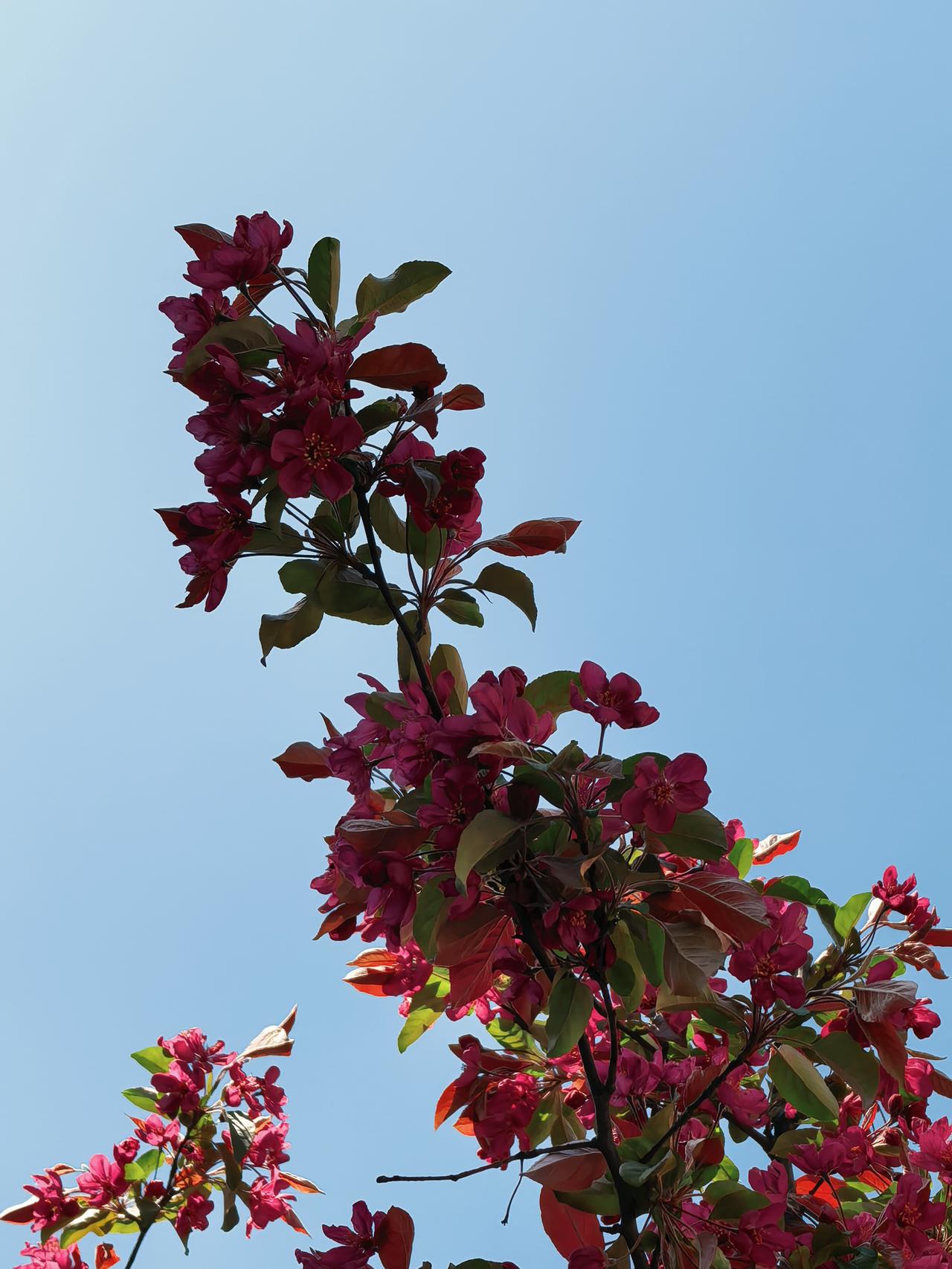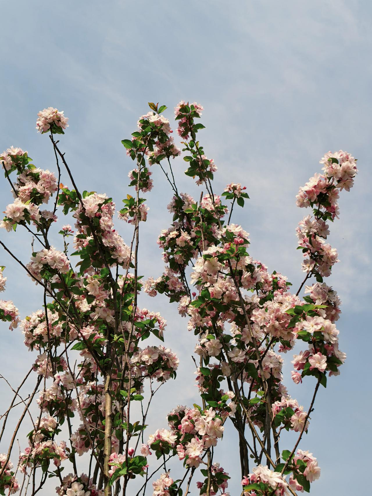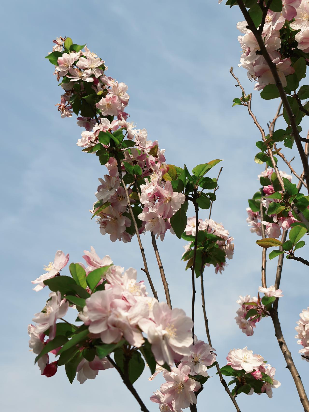 小区周边海棠花开的正艳,西府海棠叶翠花娇,北美海棠紫红一片,风儿吹过花枝乱颤,随风摇曳生姿,美的让人心醉。