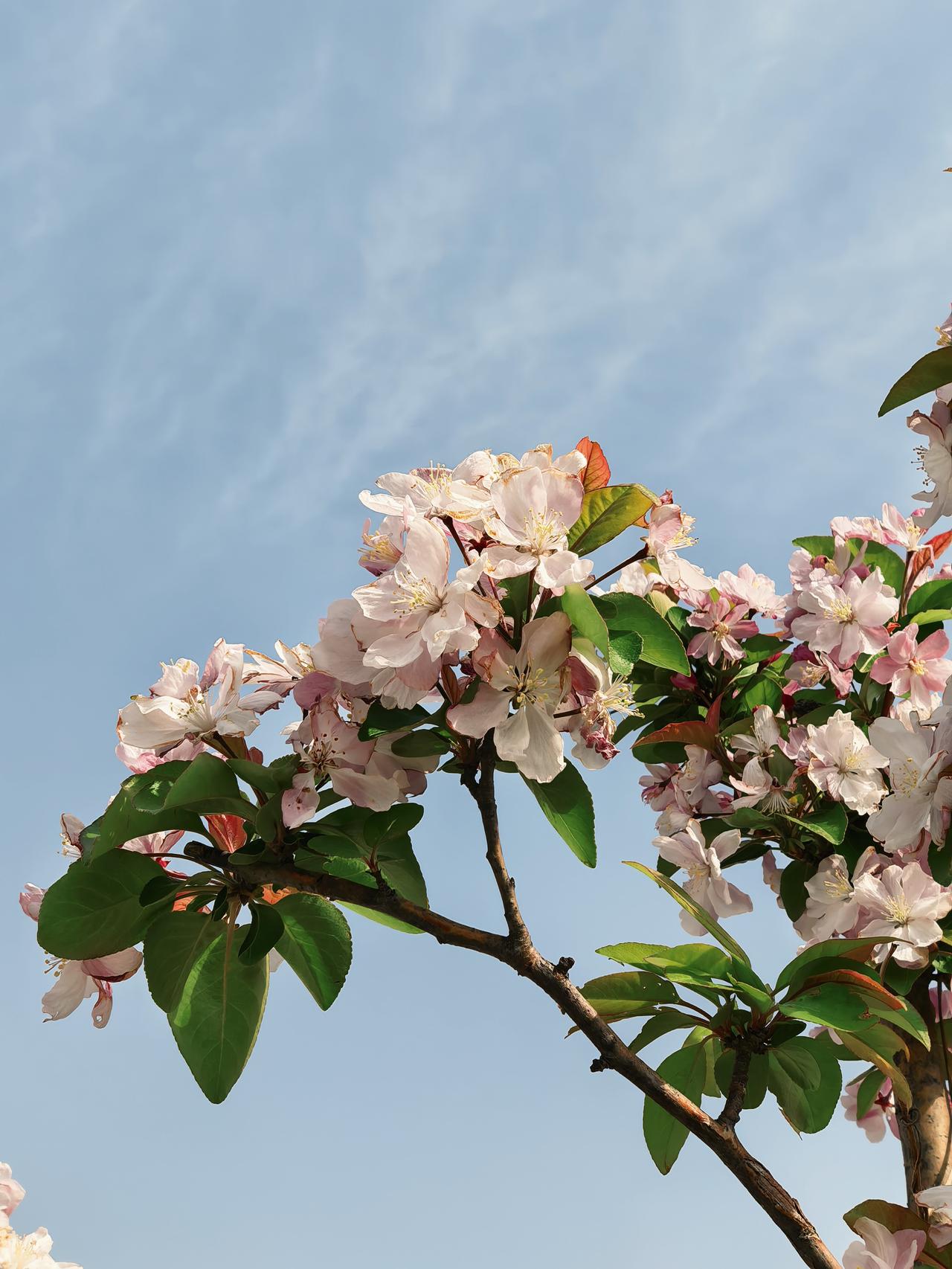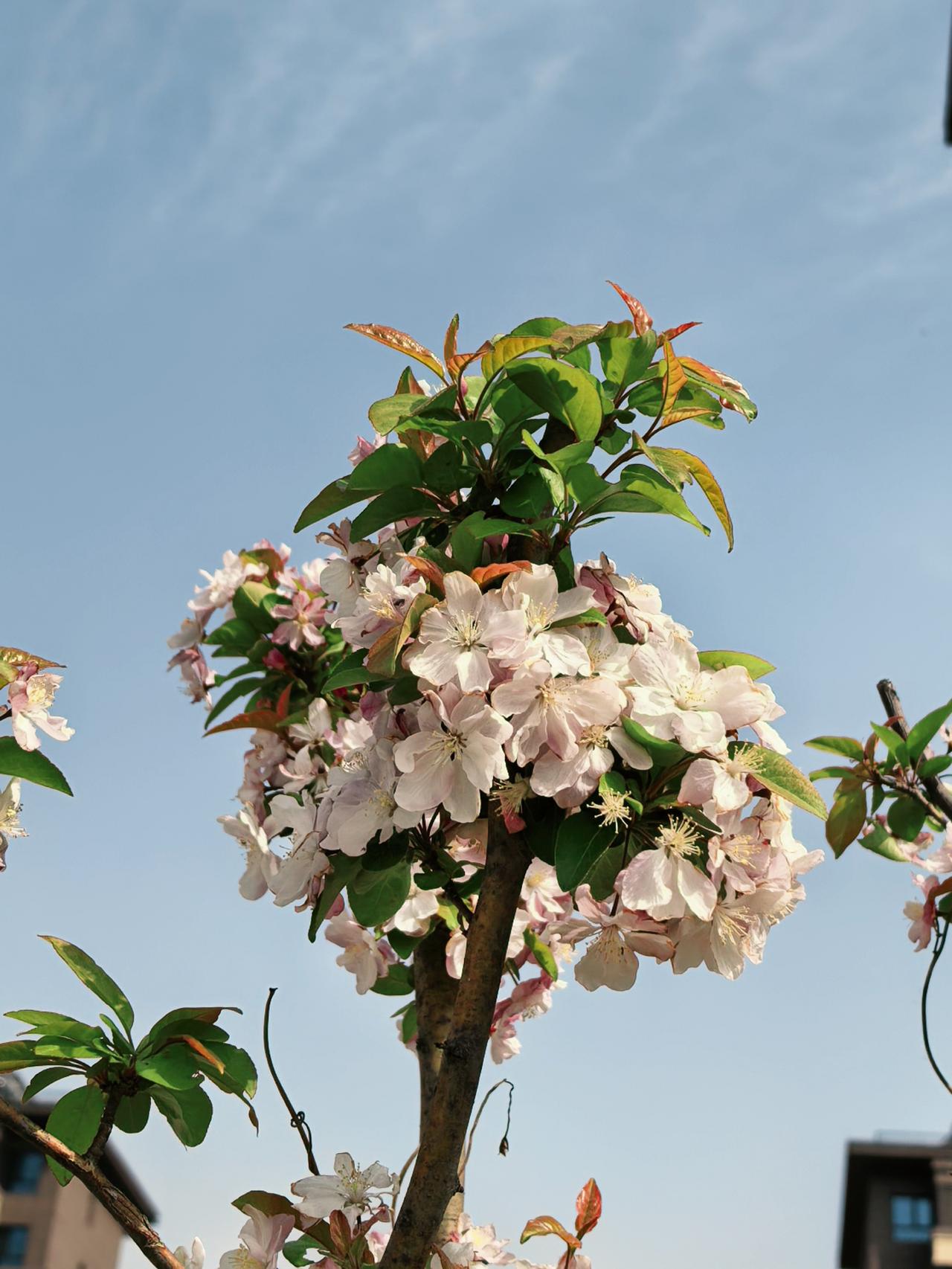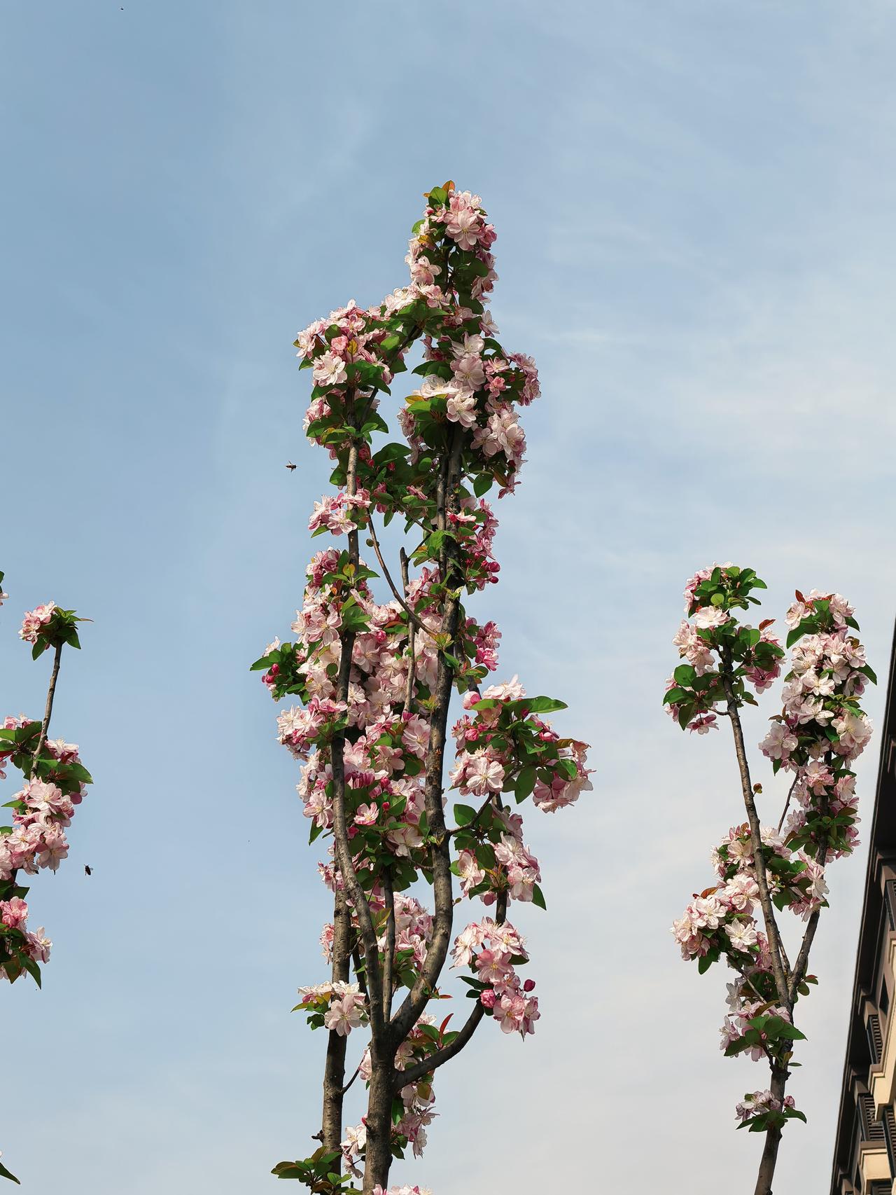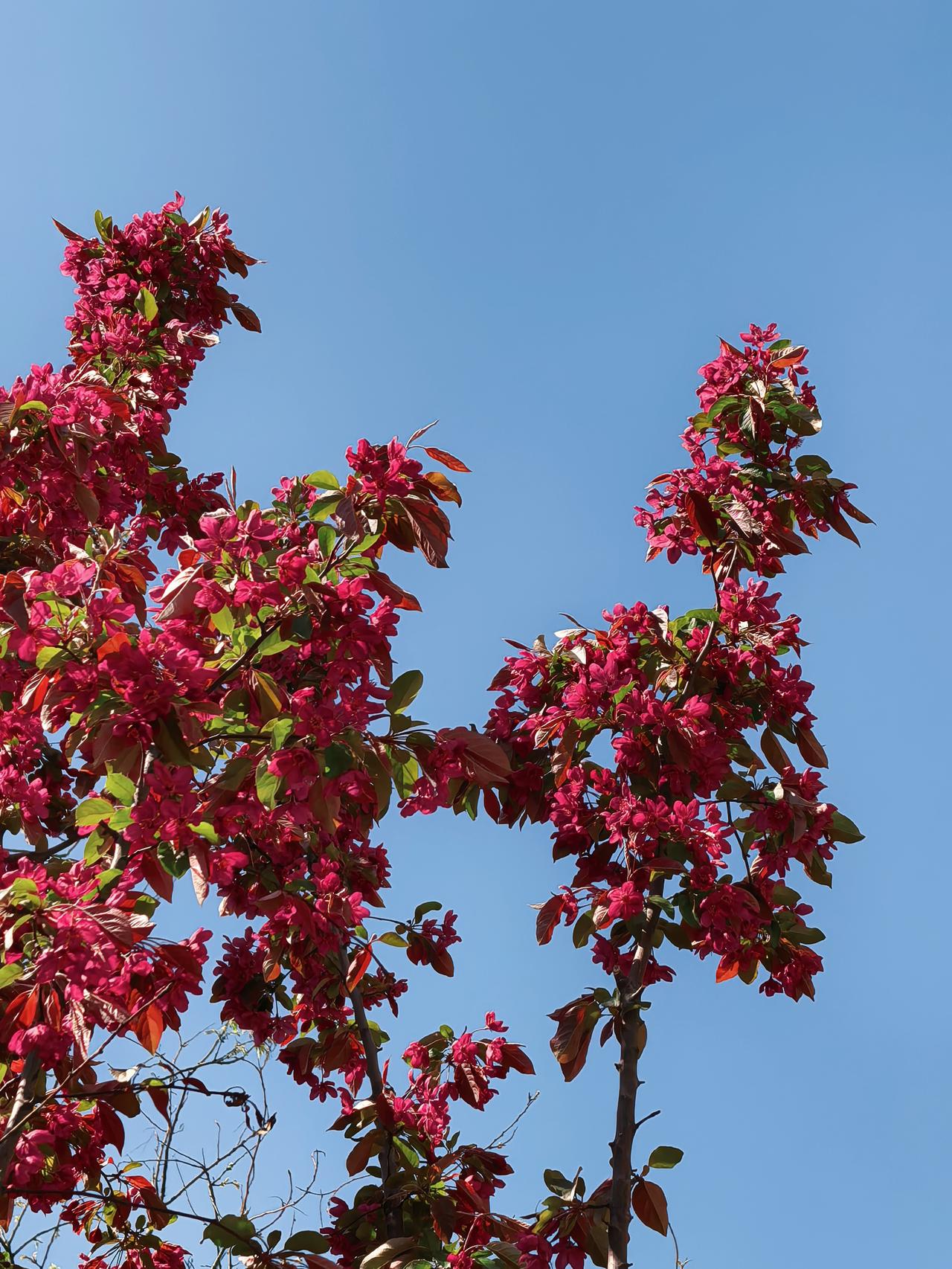 小区周边海棠花开的正艳,西府海棠叶翠花娇,北美海棠紫红一片,风儿吹过花枝乱颤,随风摇曳生姿,美的让人心醉。