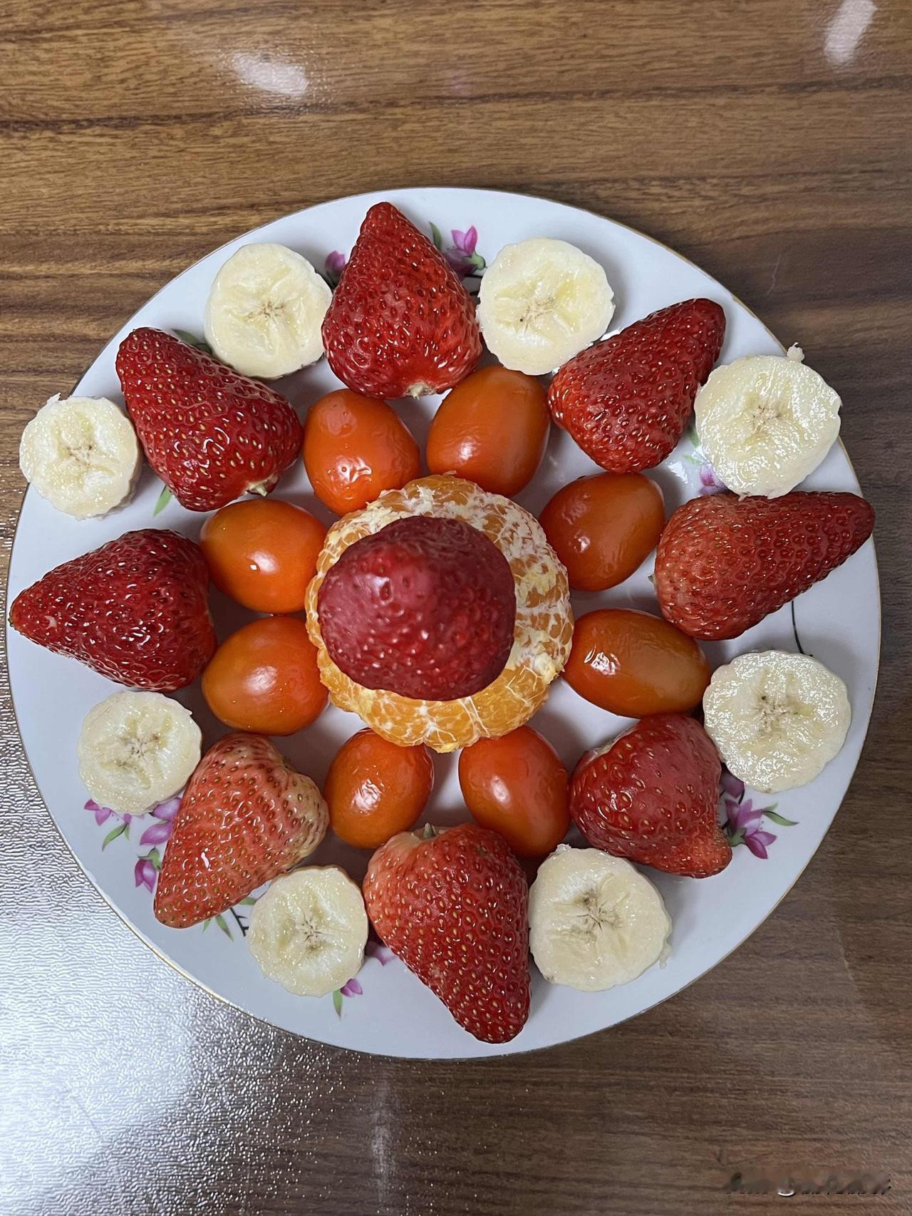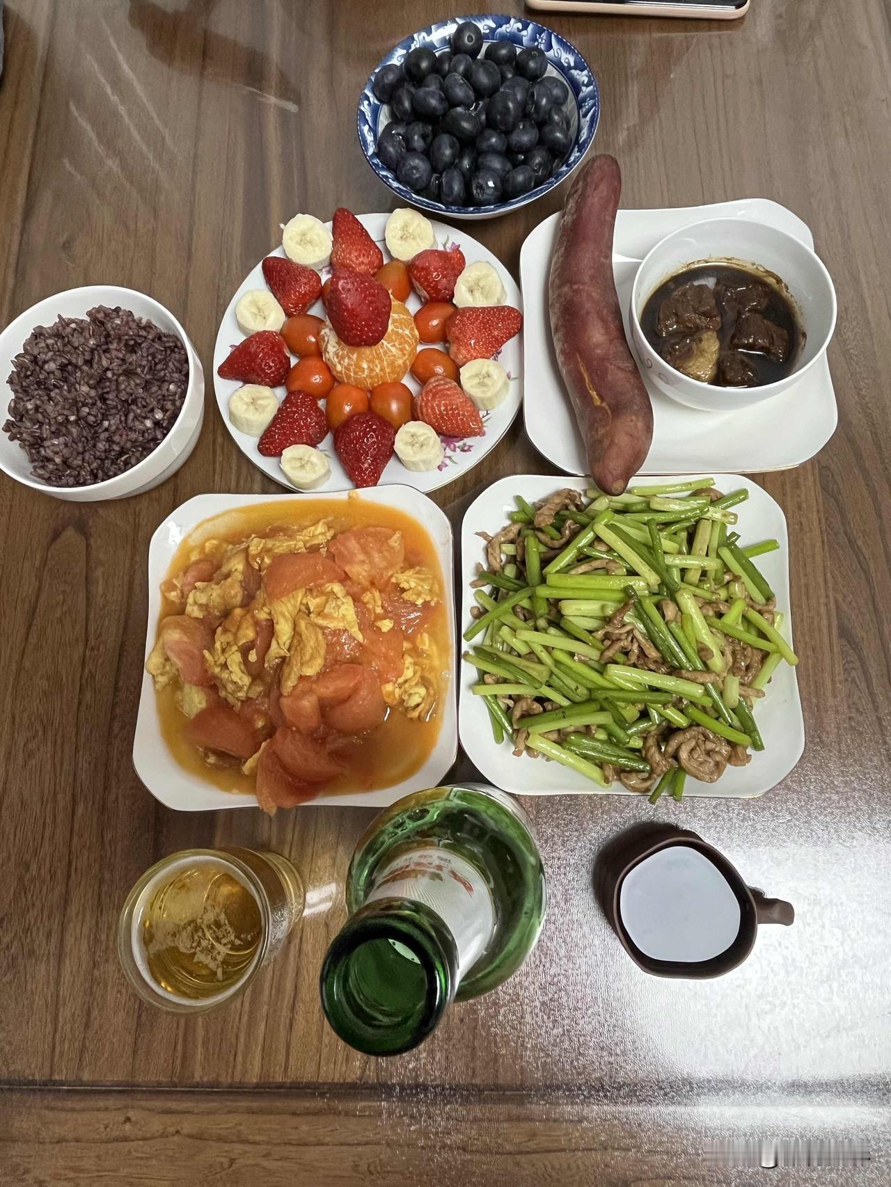 今天晚上炒了蒜苔和西红柿。昨天的羊肉剩了一点儿,和红薯一起蒸了一下。先生焖了一锅杂粮饭,我炒菜弄的果盘,一顿简单的晚餐后就齐了。