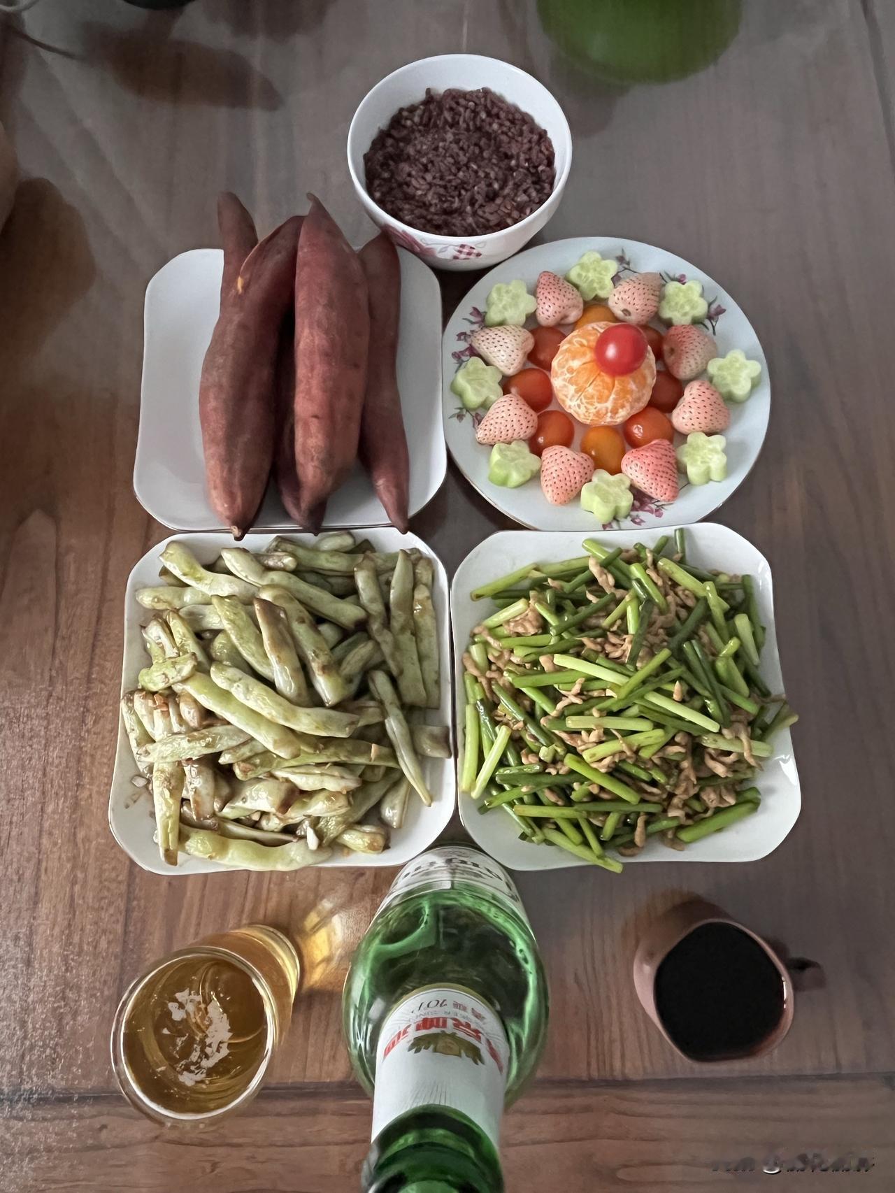然后就开始做晚饭,炒了一个素豆角一个蒜苔炒肉丝,又弄一个果盘,蒸了红薯热了玉米和杂粮饭,一顿简单美味的晚餐就齐了。