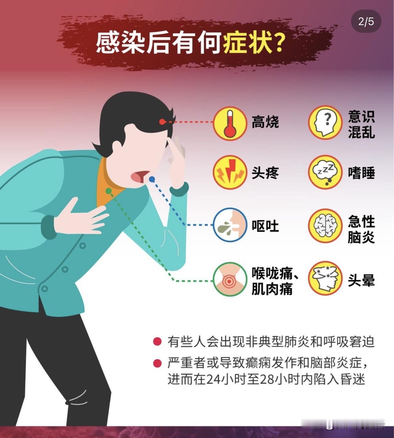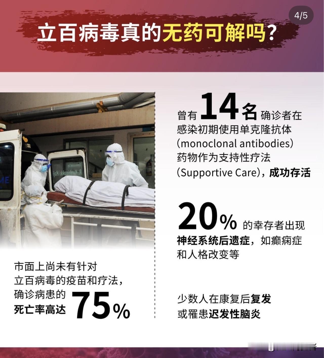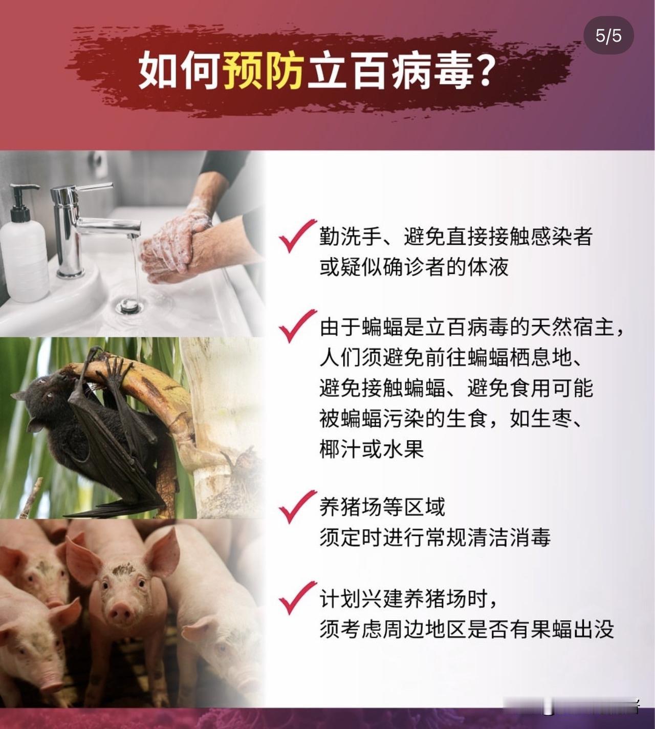 尼帕病毒,最早在马来西亚森美兰州立百新村的一个养猪场爆发,所以在东南亚也被称为立百病毒,当年在马来西亚造成百人死亡,一百多万头牲畜被捕杀。这是一种致命的人畜共患病毒,主要由果蝠携带,最可怕的是可以通过被污染的食物传播给人类,或直接人传人,死亡率高达75%。而且,这种病毒从感染到出现症状的潜伏期最长可达45天,还没有专门的疫苗和有效疗法。