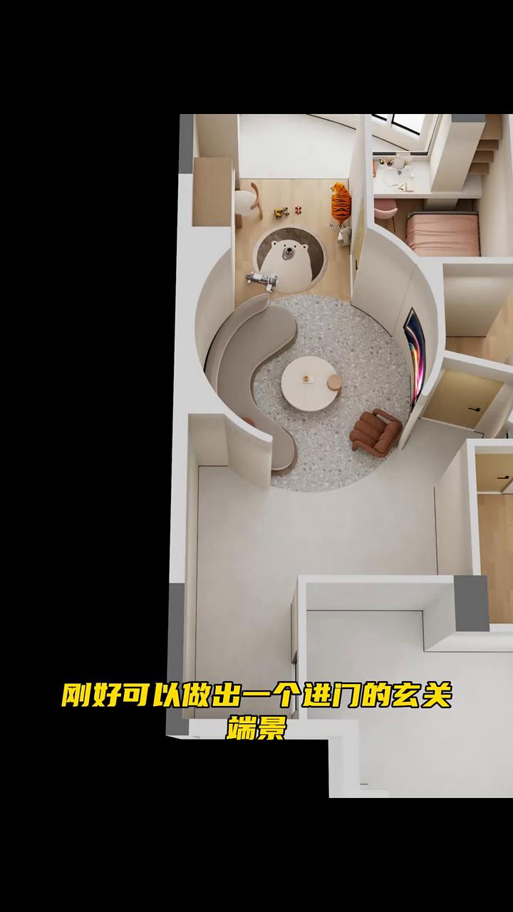 ·下方客厅空间画一个圆,放弧形沙发和电视,营造出一个其乐融融的团聚空间。沙发侧边刚好可以做出一个进门的玄关端景。