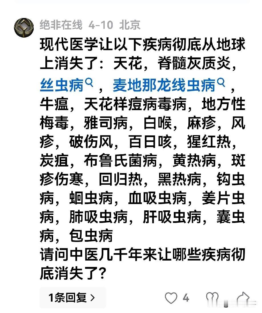 有人给他留言说:“现代医学让一下疾病从地球上消失了,天花,脊髓灰质炎,丝虫病,麦地那龙线虫病,牛瘟,天花样豆病病毒,地方性梅毒,雅司病,白喉麻疹,风疹,破伤风,百日咳,猩红热,炭疽,布鲁塞菌病,黄热病,…”