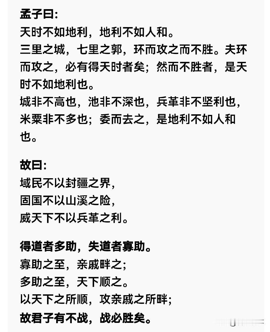 古曰:域民不以封疆之界,故国不以山溪之险,威天下不以兵革之利。得道者多助,失道者寡助。寡助之至,亲戚畔之;多助之至,天下顺之,以天下之所顺,攻亲戚之所畔,故君子有不战,战必胜矣。”