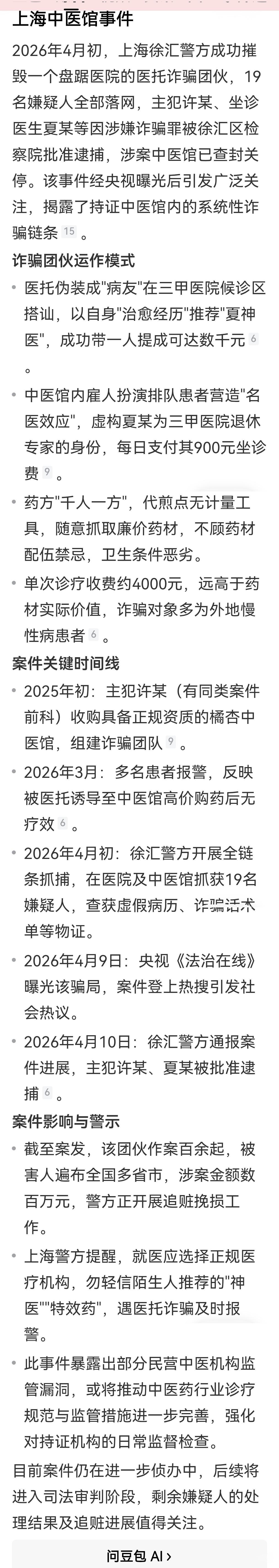 豆包说:“假中医多主要是暴利驱动(成本低,要价高)行业标准不统一,(“靠祖传秘方”忽悠)拿捏病人求生心理,(说:“西医不行我能救”)加上监管难抓,换个身份又能骗。